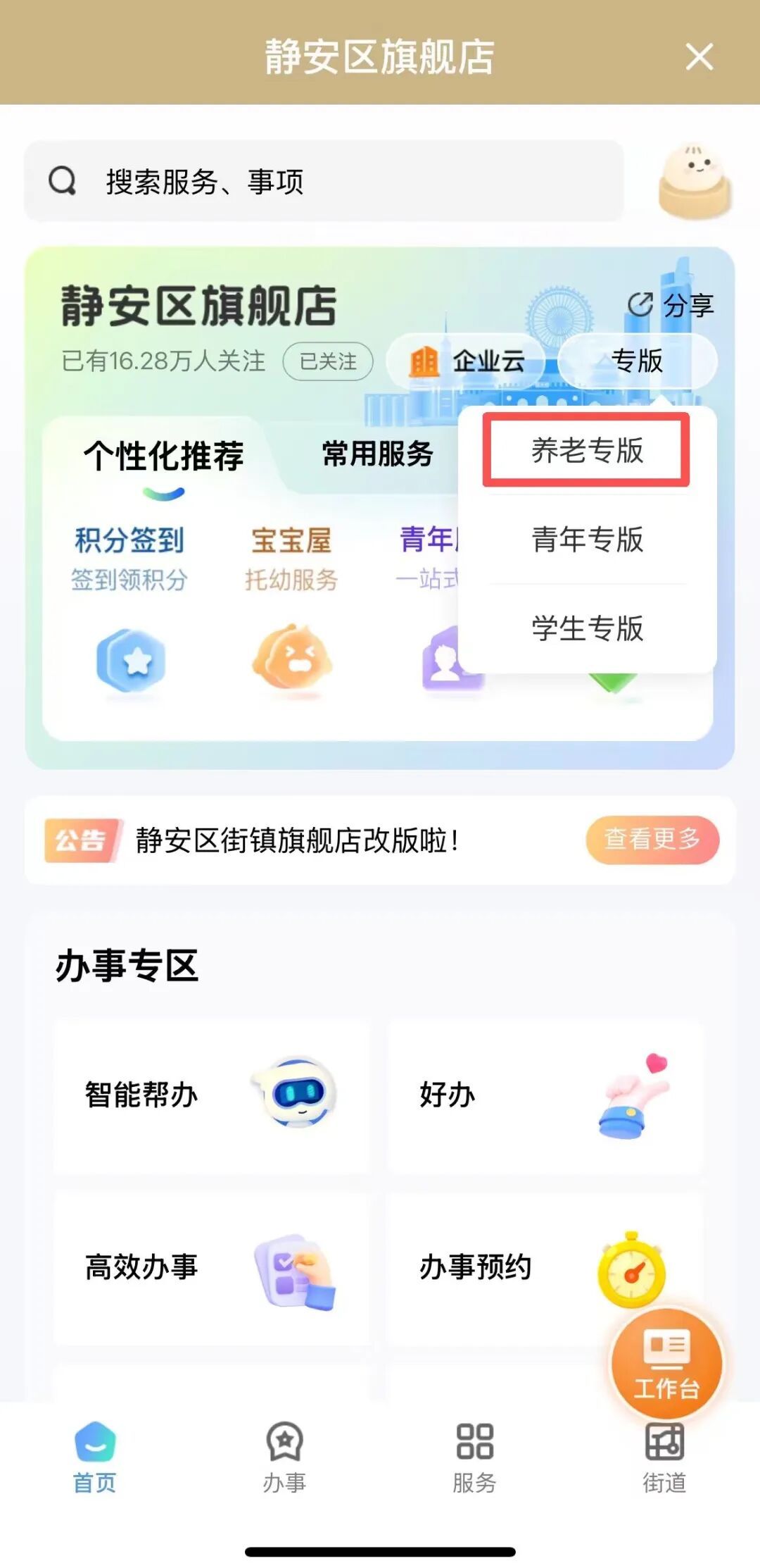 打开“随申办市民云”(APP/微信小程序/支付宝小程序),首页点击进入“静安旗舰店”右上角“专版”选择“养老专版”。