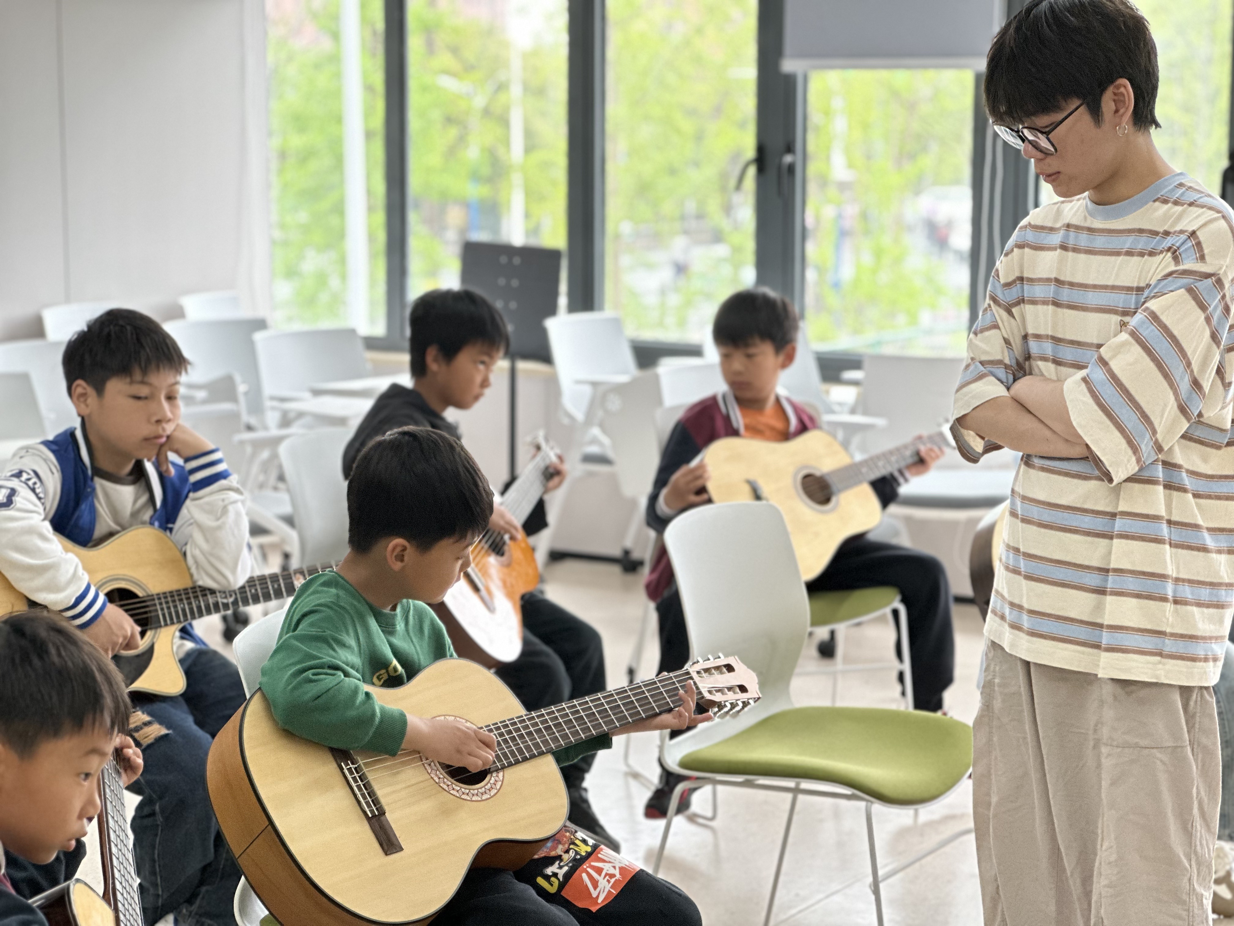 佘北党群服务中心内,小朋友正在学习弹吉他