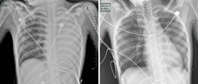 治疗前,左肺呈“白肺”状态;治疗后,“白肺”被吸收,心脏边缘清晰可见