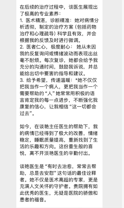 顾先生在静安区闸北中心医院焦虑抑郁专病门诊接受治疗后,在手机上一字一句地写下这封感谢信。对他而言,焦虑抑郁专病门诊负责人、神经内科主任谈艳就像一盏灯,照亮了他那段漆黑的路。