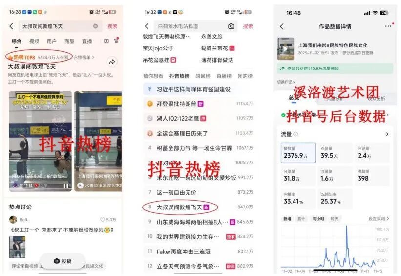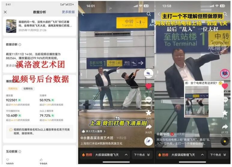 近日,一段“大叔误闯敦煌飞天”的短视频引爆全网——艺术团成员在机场自动步道上摆出舞蹈姿势拍摄视频,与最后一位大叔意外“乱入”形成强烈反差,这幕被网友调侃为“文化穿越”的瞬间。因专业艺术与人间烟火的碰撞引发广泛共情,抖音、微信视频号等各平台综合浏览量近一亿人次。戳全网都在找的“飞天”大叔,原来是咱闵行人!