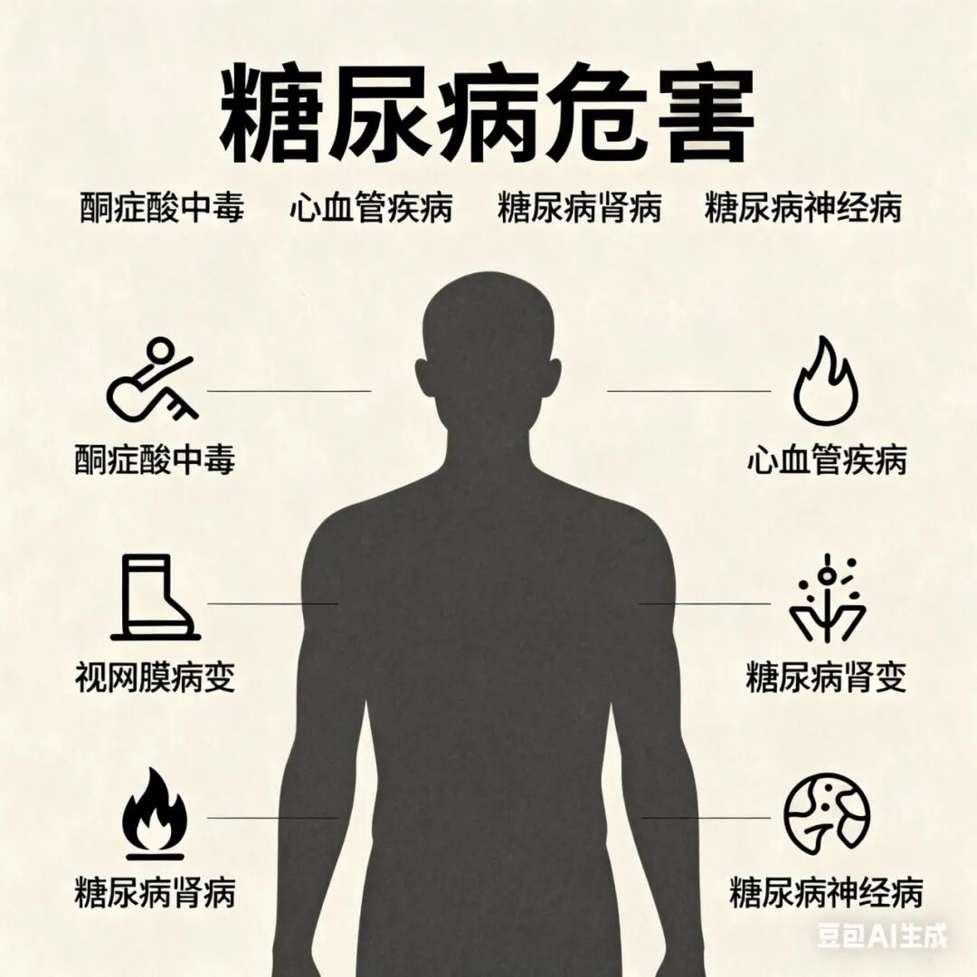一是因急性高血糖引起的糖尿病酮症酸中毒、高渗性高血糖状态等急性并发症,如果救治不及时可能危及生命。二是因长期慢性高血糖导致的慢性并发症,包括大血管和微血管病变。大血管病变主要是指动脉粥样硬化性心血管疾病(ASCVD)和心力衰竭,其中ASCVD包括冠心病、脑血管疾病和周围血管疾病。微血管病变包括糖尿病视网膜病变、糖尿病肾脏病、糖尿病神经病变。上述血管病变可以导致心肌梗死、卒中、失明、肾衰竭、截肢等严重后果,是糖尿病患者致残或致死的主要原因。