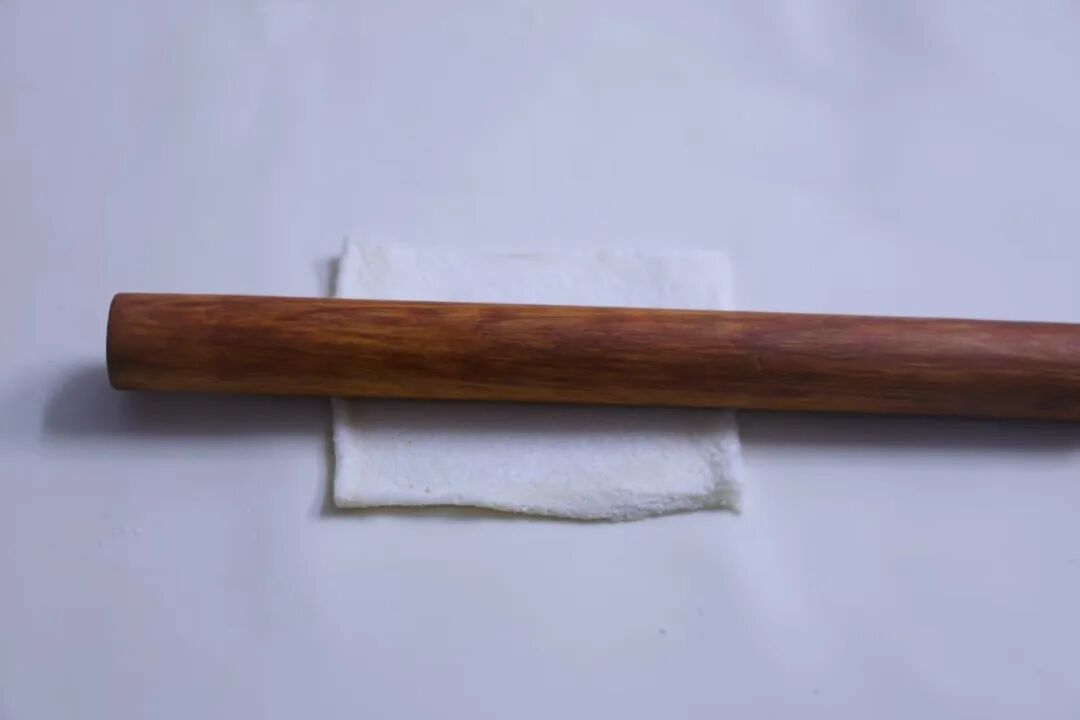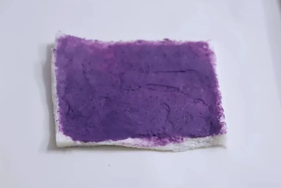 4.抹紫薯泥,均匀涂抹后卷起,刷上蜂蜜。