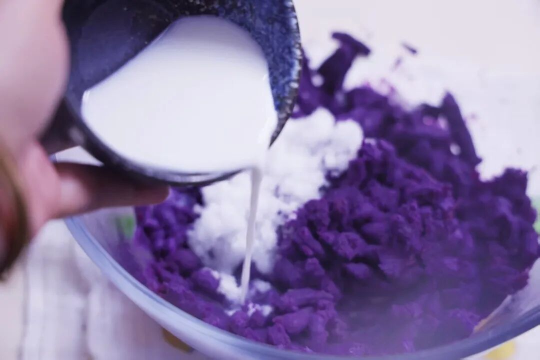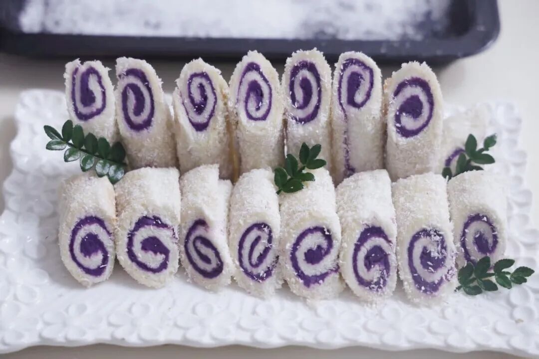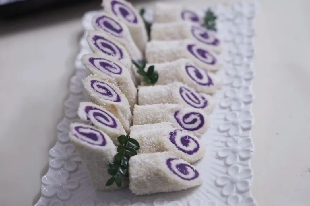 食材:吐司片8片、紫薯200克、椰蓉50克、牛奶20克、白砂糖15克、蜂蜜18克