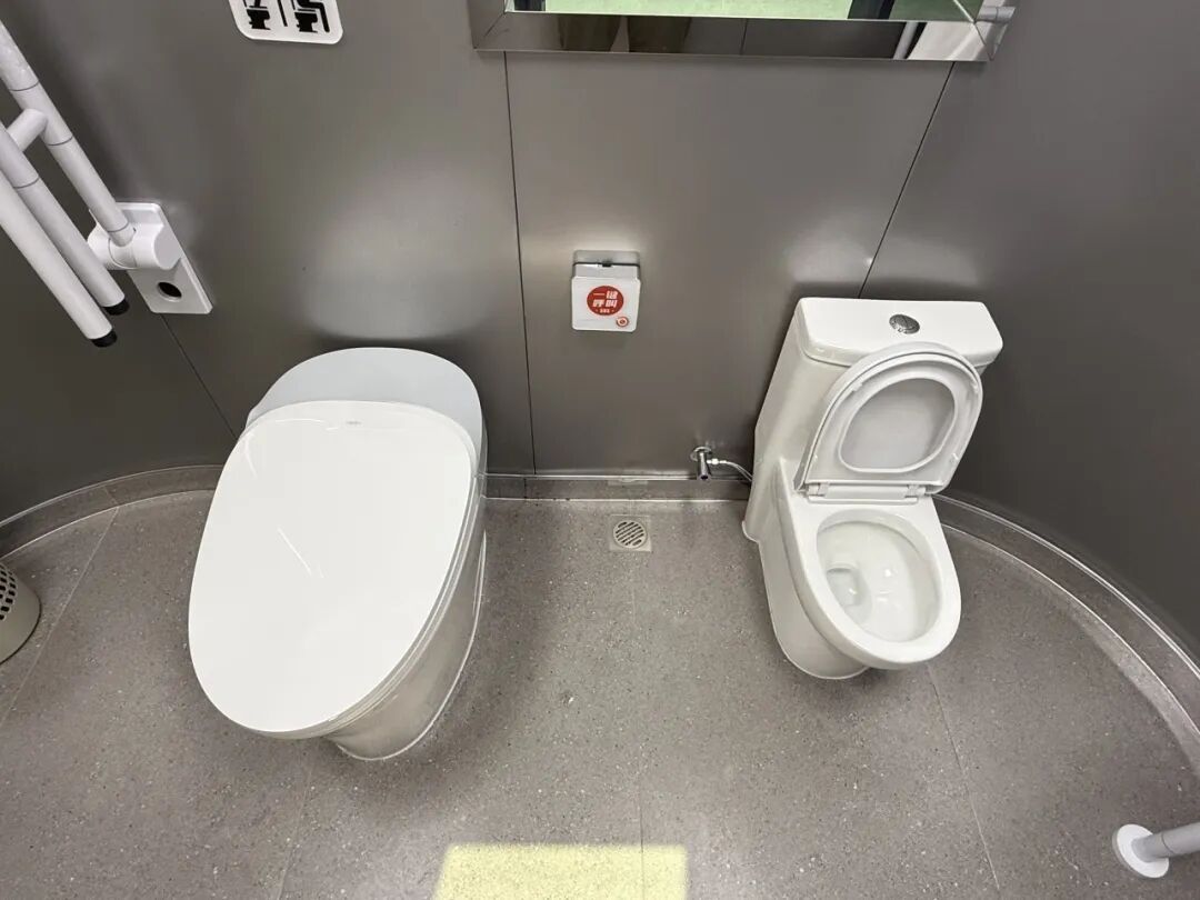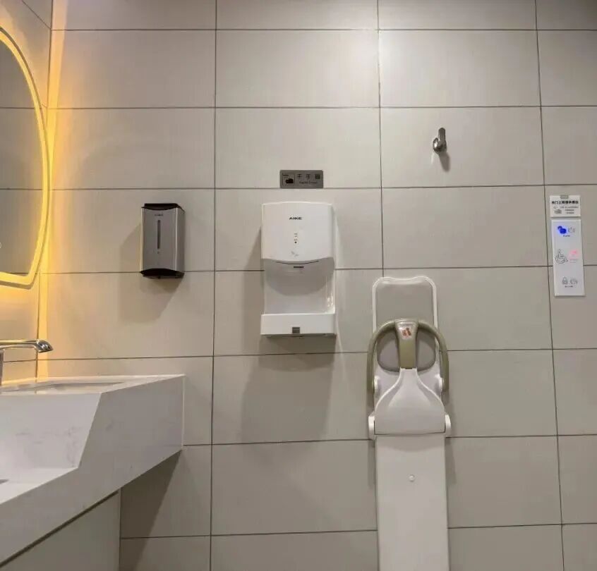 拓宽厕间空间,均安装安全助力扶手;第三卫生间专属配置婴儿座椅、恒温婴儿护理台、亲子马桶及高低洗手盆,覆盖儿童、老年、残障等多元群体需求,实现“全年龄段无障碍使用”。