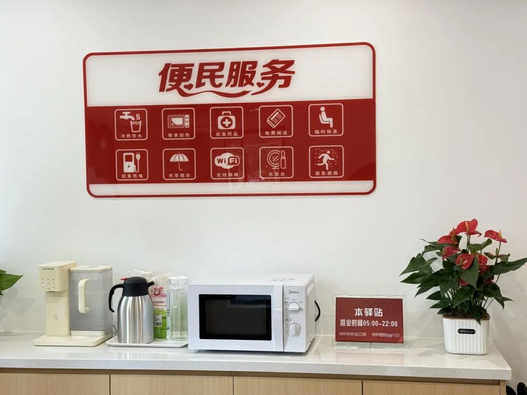 增设13.5平方米友好驿站,配置空调、微波炉、急救药箱及免费阅读书架等,切实解决快递员、环卫工人等群体“热饭难、歇脚难”问题。