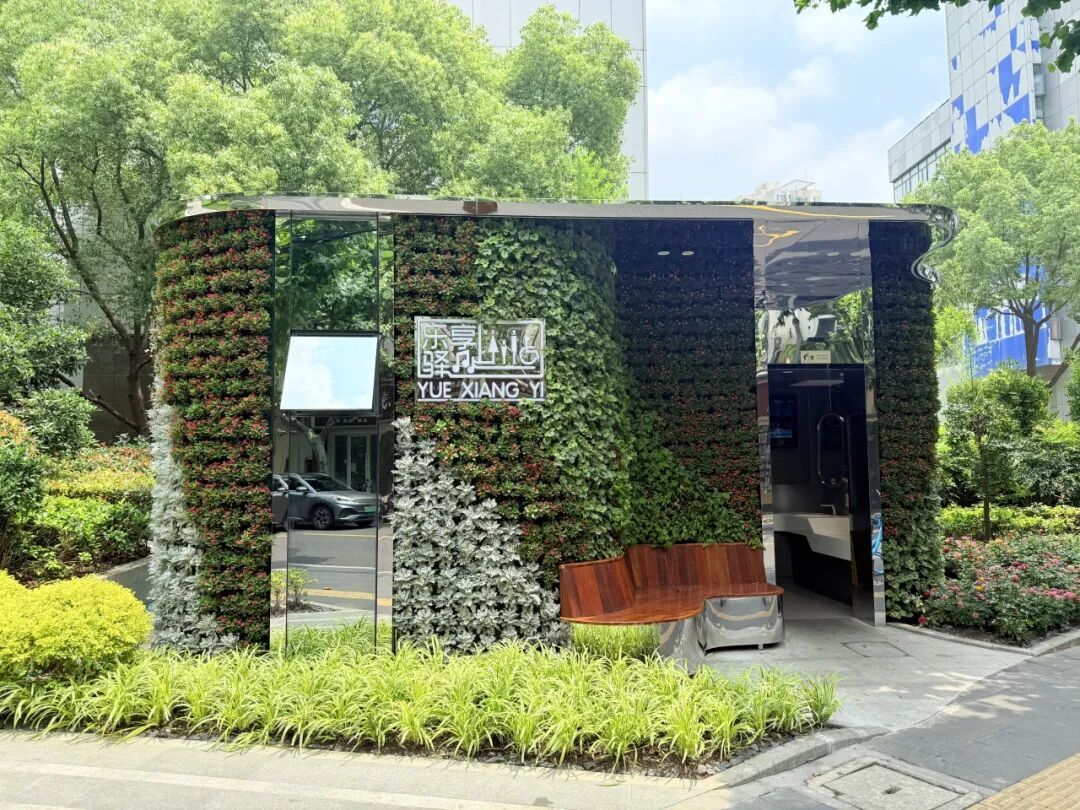 乐享驿外立面大面积铺设垂直绿化,通过立体绿化与音花园生态环境无缝衔接,采用不锈钢镜面材质,反射周边绿植景观,实现建筑与自然的视觉统一,打造“花园中生长的公厕”。