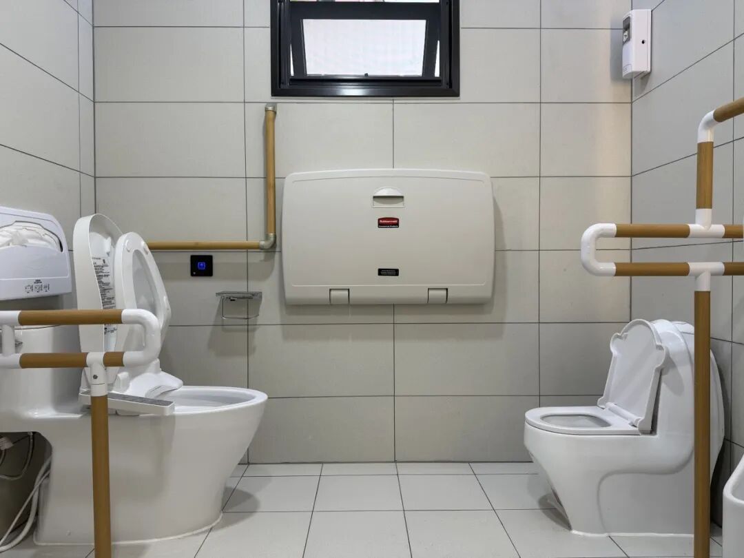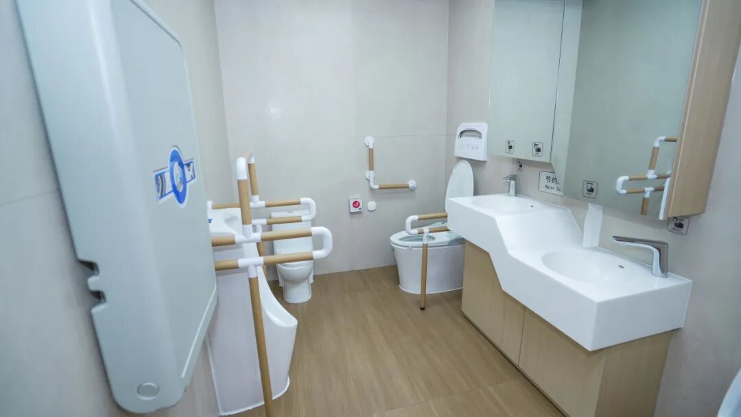 优化残疾人坡道坡度,加装木质适老扶手,保障轮椅通行安全;第三卫生间配备婴儿护理板、安全扶手、亲子马桶及高低洗手盆,兼顾老年群体与儿童使用需求;采用感应龙头、自动马桶等无接触设备,搭配厕间一键呼叫装置与防跌倒监测系统,提升使用安全性与便捷性。