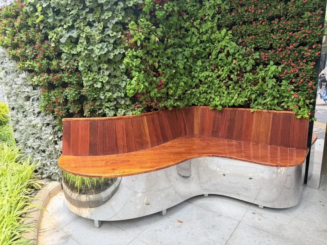 外部打造33平方米开放式连廊休憩区,配备仿木纹长椅、充电接口,为户外工作者提供避雨遮阳的临时歇脚空间,连廊铺设防滑木纹砖,与周边环境和谐呼应。