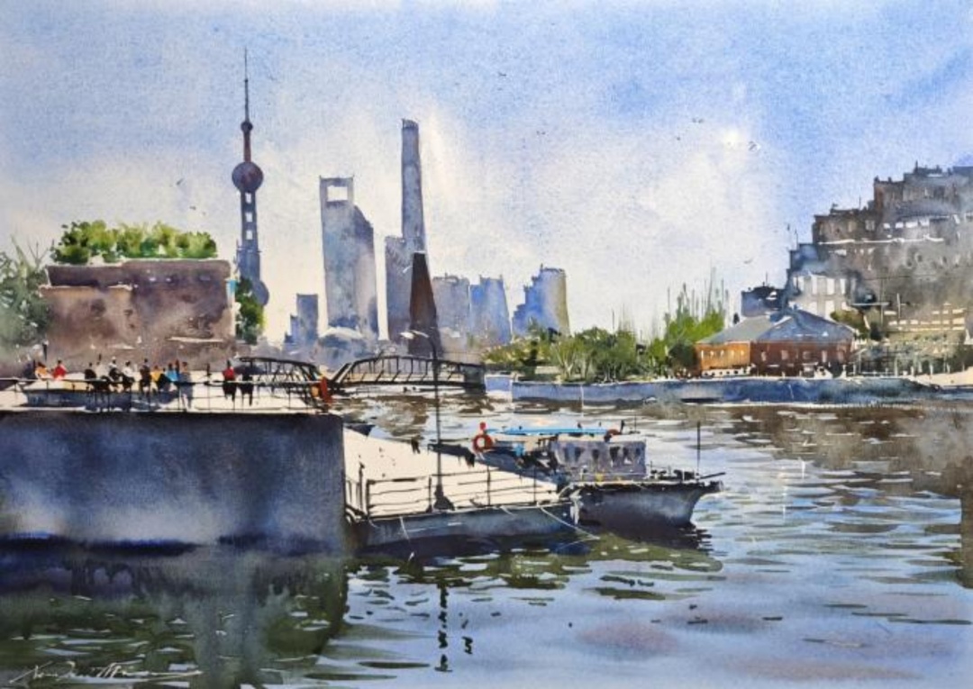 画的时候我想抓住的是那种白天的透明感——天空干净,江水亮得晃眼,船只慢慢驶过,水面把现代和老上海的影子都装了进去。外滩对我来说,就是上海跟世界打招呼的地方。