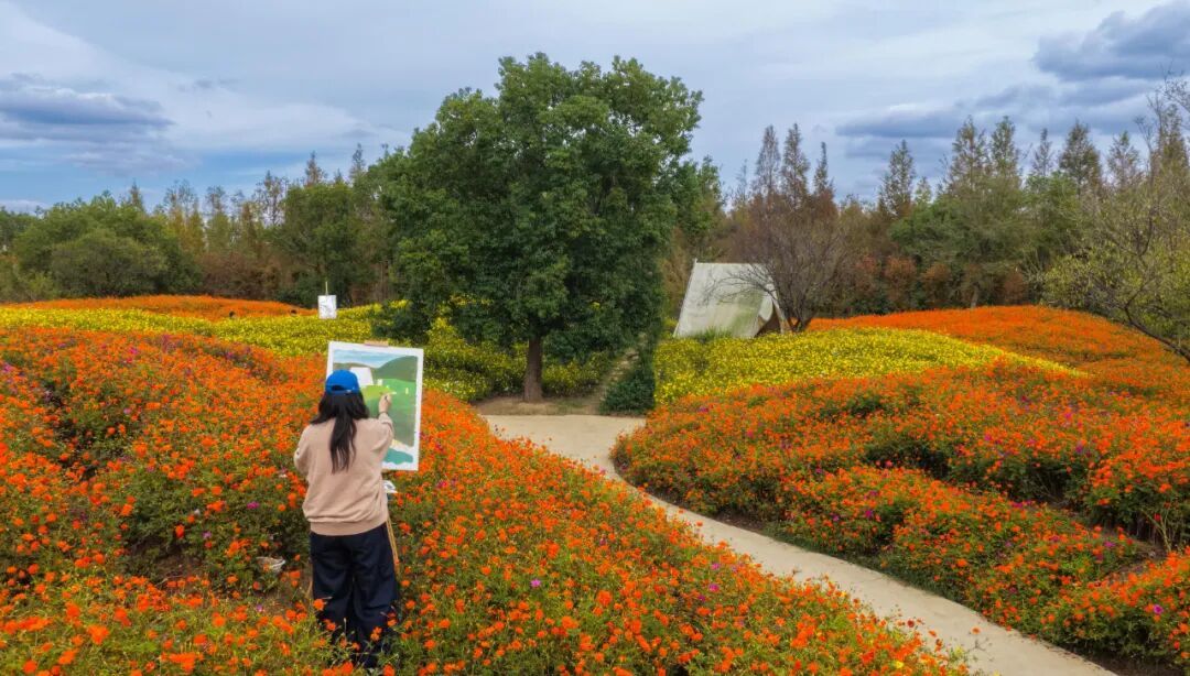 这片地肤的红色浪漫,并非孤独的独奏。田埂边、小径旁,象征幸福的格桑花烂漫盛开,纤细的花姿在微风中摇曳,为游人的裙摆点缀灵动的背景。不远处,硫华菊那金橙色的花海热烈依旧,仿佛一片流淌的阳光;花团锦簇的百日菊则以饱满的姿态,将秋日的绚烂与丰饶诠释到极致。微风拂过,地肤草浪与缤纷花海共同摇曳,沙沙作响,吟唱着秋日的私语。