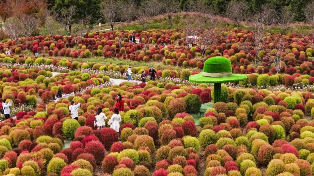 近日,朱泾镇花开海上生态园迎来一年中最富诗意的时节。园内三十万株地肤草已悄然披上秋日“红妆”,红色覆盖率超过80%,宛如一团团蓬松的火焰,在起伏的丘陵间静静燃烧,吸引众多市民游客奔赴这场毛茸茸的秋日邀约。