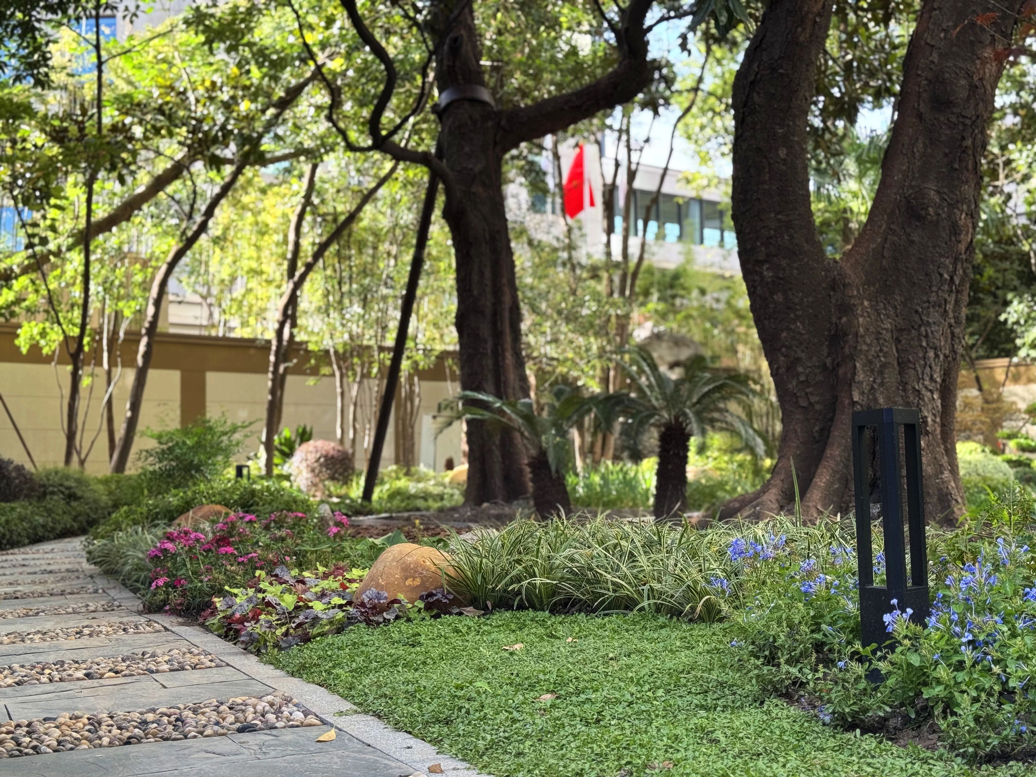 生态保护被置于首位。改造严格遵循2025年《古树名木和古树后续资源管护技术规范》(DB31/T 682-2025),科学选用了浅根耐阴的大吴风草、玉簪、肾蕨等植物,既丰富林下层次,又减少对古树根系的干扰。