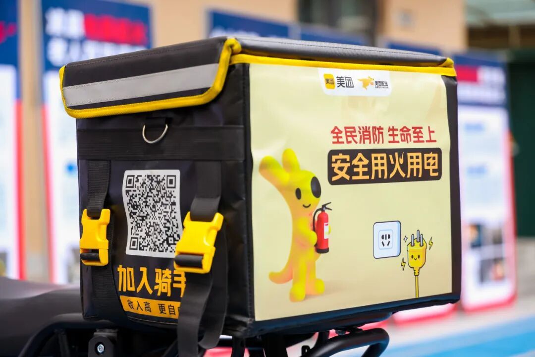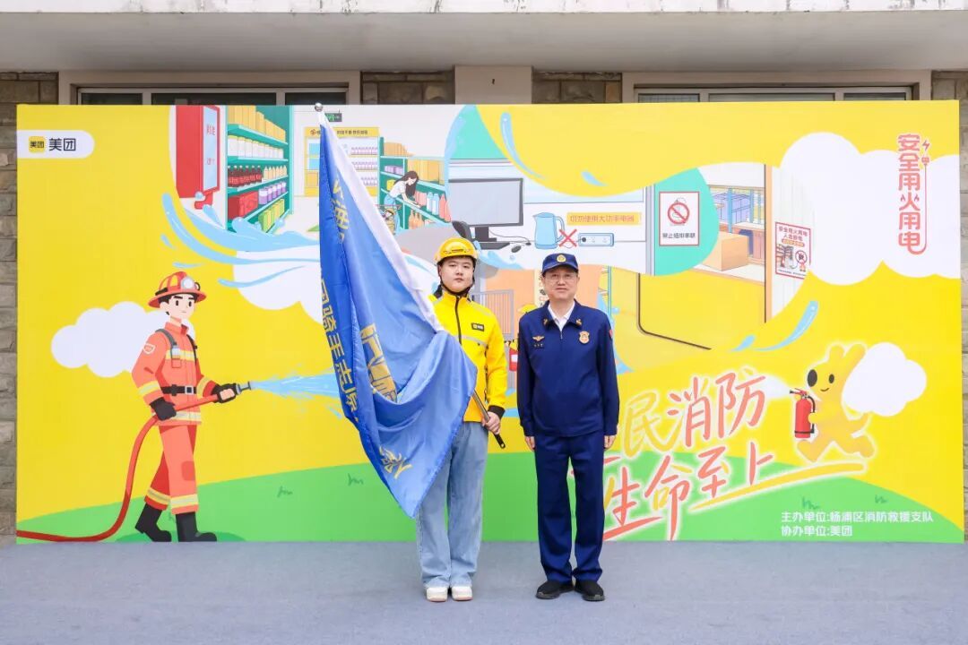 在授旗仪式上,杨浦区消防救援支队与美团安全管理部的相关负责人共同为骑手代表授予了象征着责任与荣誉的志愿服务队队旗。同时,骑手们的电动自行车餐箱,也统一换上了醒目的消防宣传贴。这些移动的“安全广告位”将随着骑手的足迹,覆盖杨浦乃至更广阔区域的大街小巷,将“安全用火用电”等消防常识精准送达千家万户,使消防安全意识在潜移默化中深入人心。