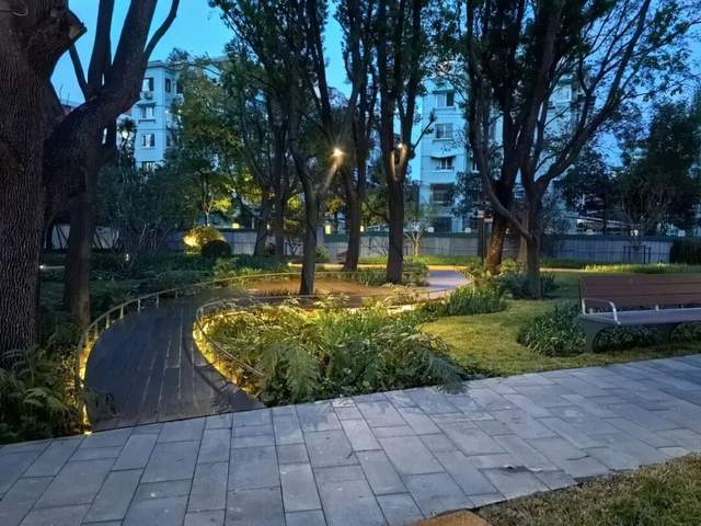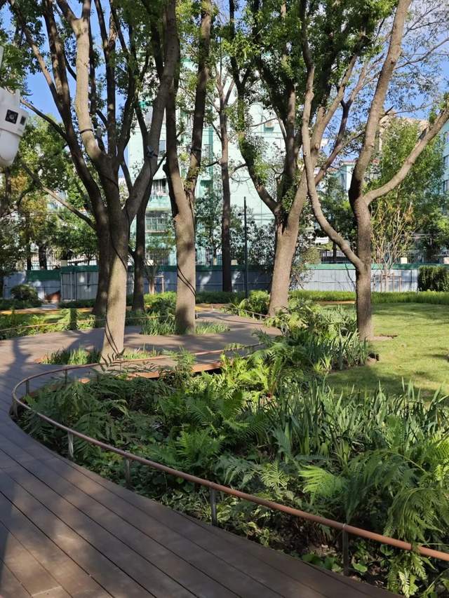 改造后的广场,绿意更浓了。在生态景观方面,最大程度保留现场植物外,还对大乔木进行修剪,调整场地郁闭度,在活动密集区打造阳光草坪,林下增设木栈道及雨水花园。阳光草坪选用耐践踏草坪品种中华结缕草,中层增加紫薇、垂丝海棠、蜡梅等开花小乔木,地被种植了多种耐湿、净化能力强的植物,并增加了绝代佳人月季、鼠尾草等开花植物,优化植物层次,提升空间观赏性与生态舒适度。