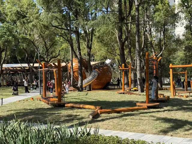 根据老年群体、健身爱好者等不同行为习惯,项目优化健身器材选型、休憩设施数量,增设健身步道,让设计真正回应民生关切。“以前带孙子来只能在长椅上坐坐,现在有这么多好玩的地方,都不想走了!”张阿姨乐呵呵地说道。