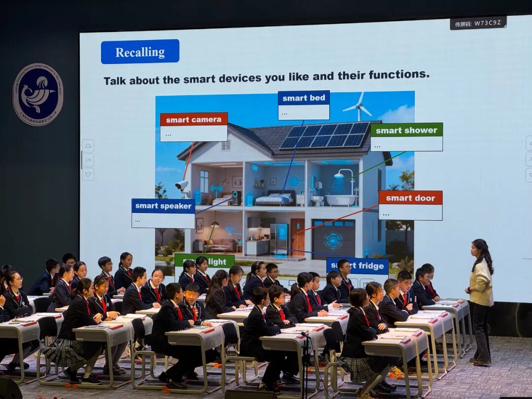 开幕式上,两节特色鲜明的英语课率先亮相。从“为家人网购服装”到“探讨智能生活利弊”,从课本走向真实生活,课堂将焦点从语言知识转向了解决实际问题的能力。在“网购”主题课中,学生们模拟使用AI生成为家人挑选服装,学习表达与协商;在“智能生活”主题课中,学生们则深入探讨科技带来的利弊问题。