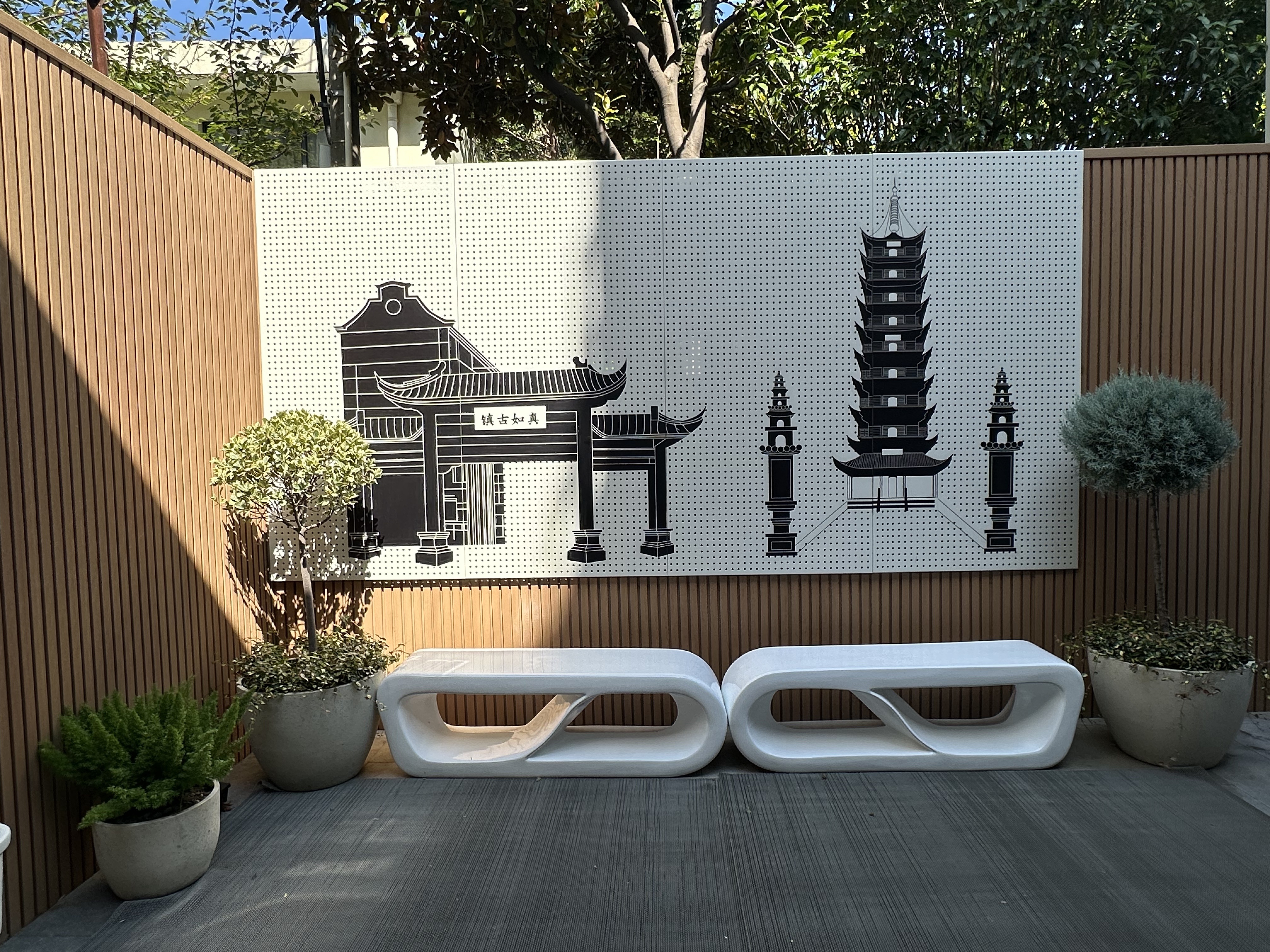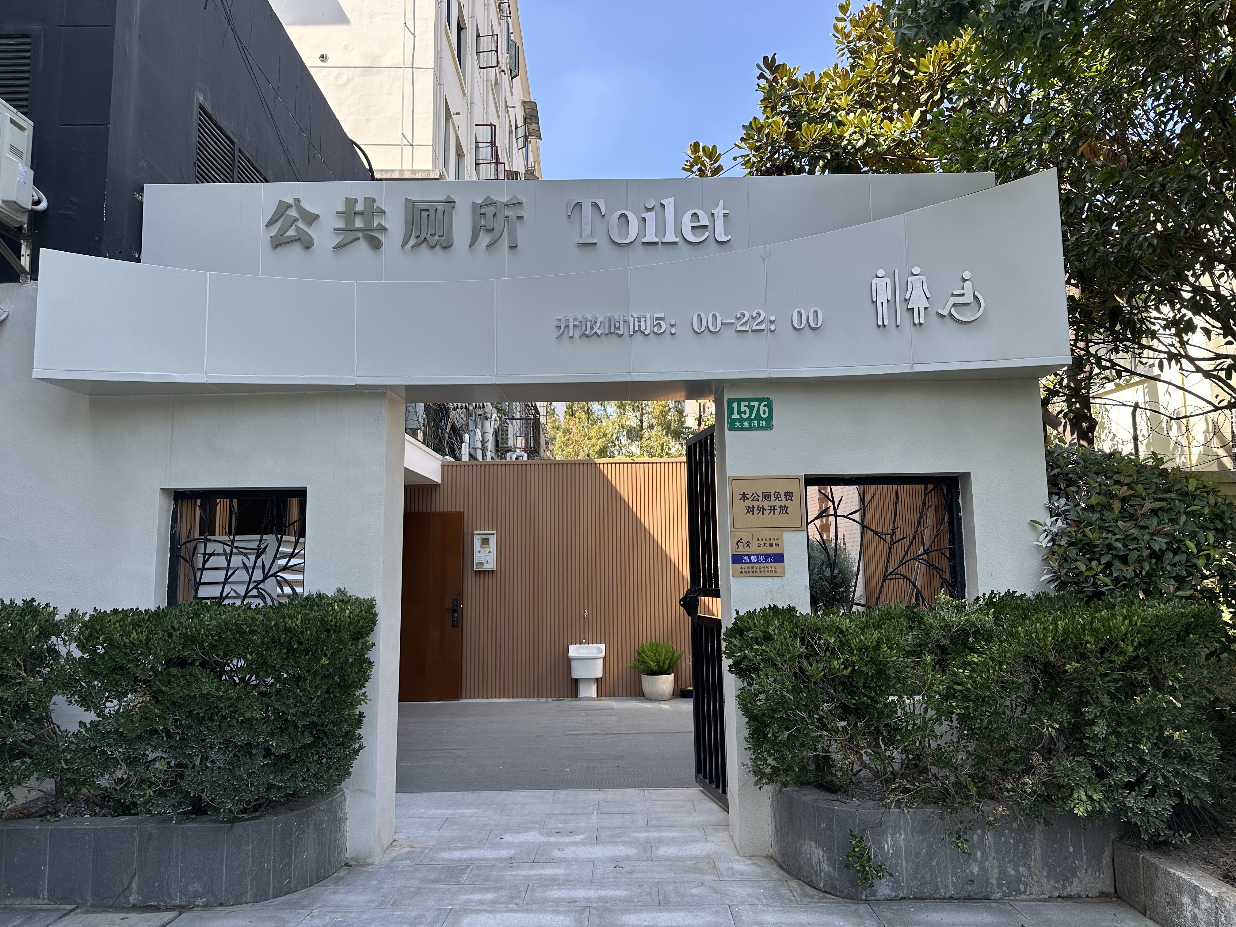荣获“最美厕所”的大渡河路1576号公厕,巧妙地将现代科技融入古镇风貌。其外观以素净白墙为底,搭配弧形门头设计与现代不锈钢背光字,再以铁质窗花勾勒竹影,使建筑自然地融入真如古镇的街巷肌理。