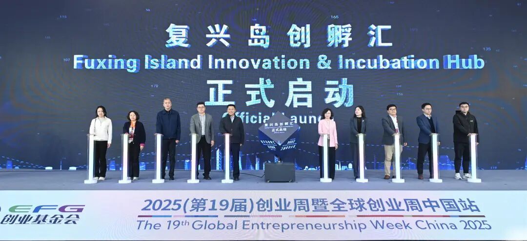 在“复兴岛创孵汇”启动仪式环节,杨浦区委常委、常务副区长尼冰与高质量孵化器、大企业开放中心等代表共同按下启动装置。