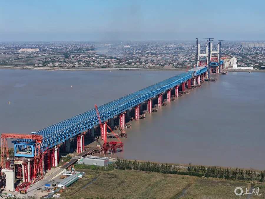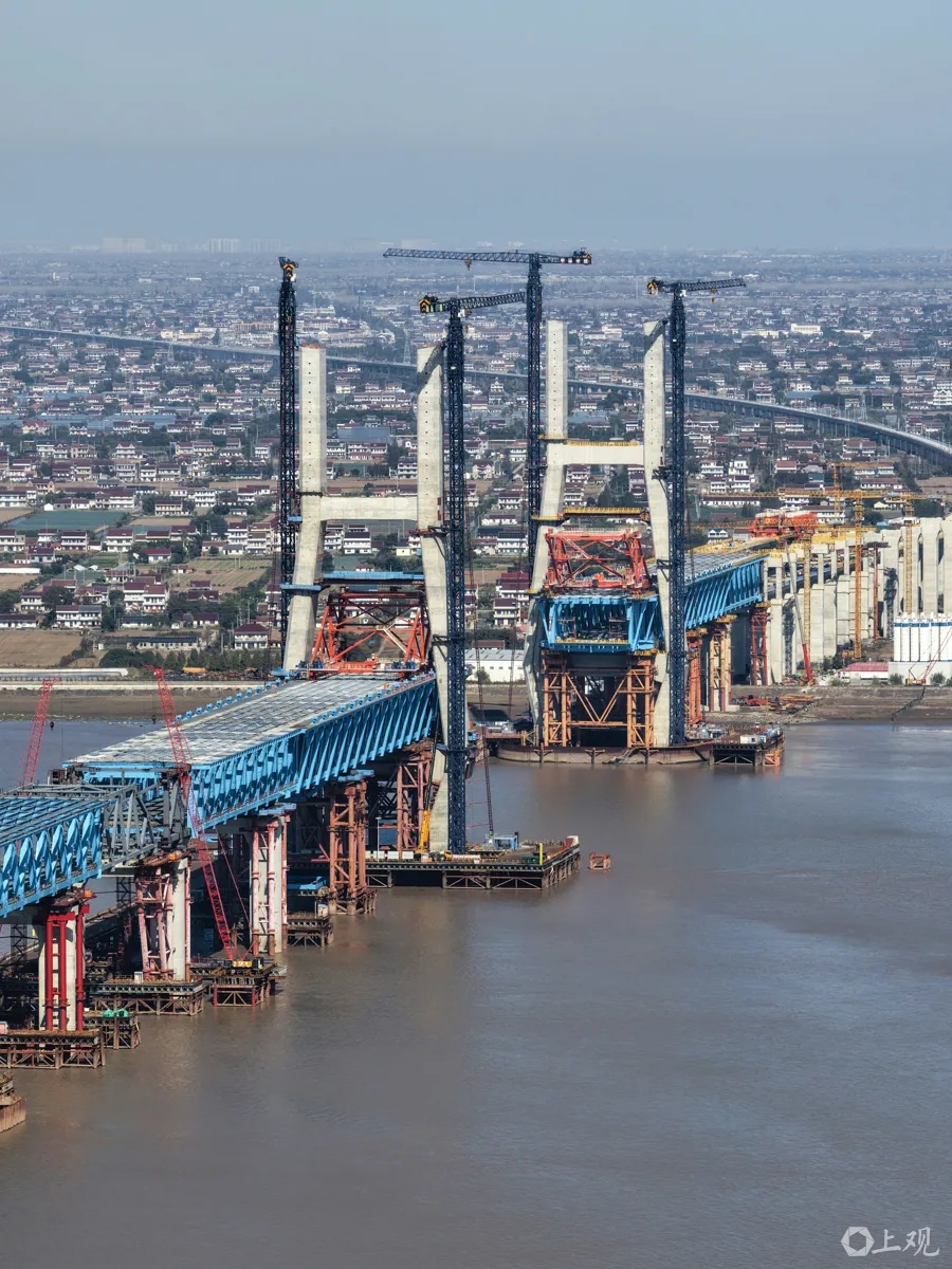 近日 沪渝蓉高铁控制性工程 崇启公铁长江大桥建设 迎来重大进展! 高度153米的3、4号双主塔 已顺利封顶 非通航孔钢梁全部架设完成 并进入最后一轮顶推阶段 据悉,崇启公铁长江大桥3号墩、4号墩主塔标准节包括塔基、下塔桩、中塔柱、上塔柱和塔顶五个部分组成,高153米,分27个节段施工。此次浇筑的上塔柱第26节单节高度6米,长9.7米、宽6米,混凝土182.69立方米。 目前项目已完成总工程量的80%,正推进斜拉索挂索与钢梁合龙准备,预计明年3月实现崇明岛与启东侧钢梁“牵手”。 大桥上层为双向六车道公路,下层通行350公里时速高铁及250公里时速城际铁路,建成后将大幅缩短长三角城市时空距离,上海至启东车程仅需25分钟。 崇启公铁长江大桥是北沿江高铁的控制性工程,是上海至南京至合肥高铁控制性节点工程,全长4.09公里,横跨长江入海口北支航道,采用双层公铁两用无砟轨道斜拉桥的设计,上层为设计时速100公里的双向六车道一级公路,下层为设计时速350公里的双线高速铁路及设计时速250公里的双线城际铁路,主通航孔跨径达400米,是目前在建的世界最大跨度公铁两用无砟轨道斜拉桥,也是长江上迄今为止设计时速最高的公铁两用过江通道。 项目建成后,将在上海都市圈、南京都市圈和合肥都市圈间建起一条快速新通道,对于优化沿长江地区铁路网布局、落实长三角区域一体化发展和长江经济带发展国家战略、促进跨江融合发展意义重大。 转载请注明来自今日闵行官方微信