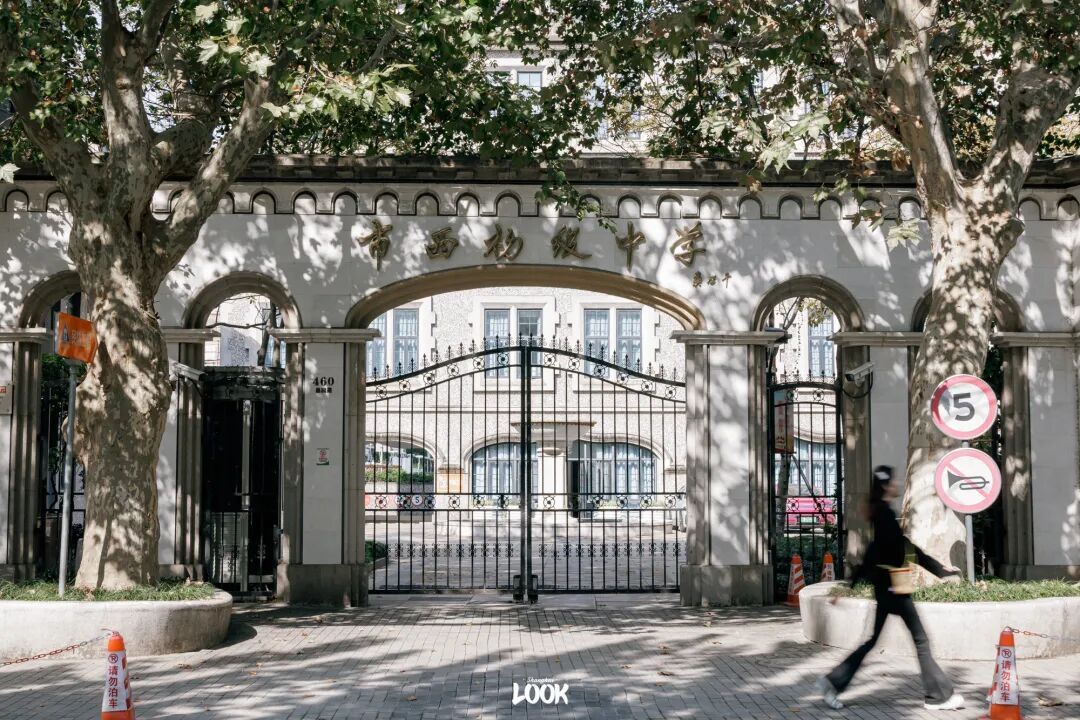 树影的斑驳落在市西中学的门头上,在学校这个本就宁静的地方,秋叶与市西中学的灰色墙壁交相辉映,互成一方秋色。
