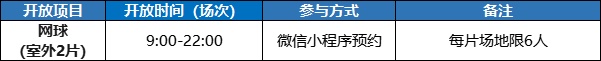 康东网球馆免费开放项目:网球(室外2片)。每片场地限6人,开放时间为9:00—22:00,感兴趣的市民可在“上海市体育场馆设施管理中心”微信小程序上预约。