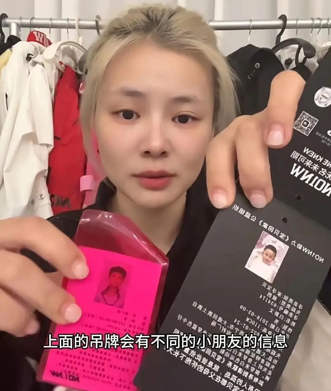 滑雪服官方品牌负责人孟女士展示寻亲吊牌