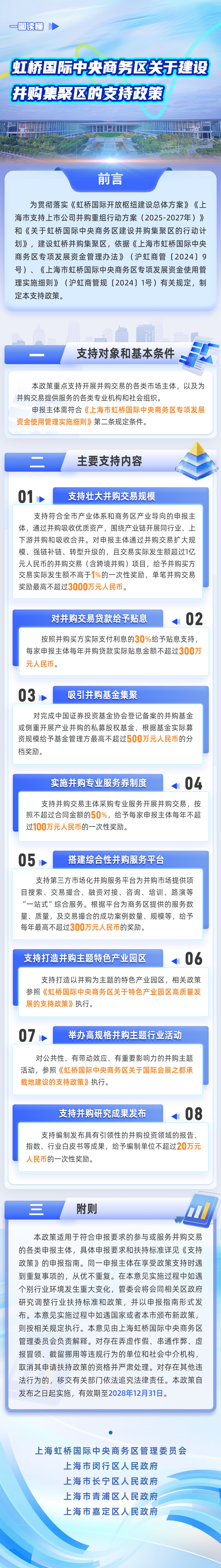 《虹桥国际中央商务区关于建设并购集聚区支持政策》(点击文末“阅读原文”可查看政策全文)近日印发,主要包括支持壮大并购交易规模、对并购交易贷款给予贴息、吸引并购基金集聚、实施并购专业券制度、搭建综合性并购服务平台、支持打造并购主题特色产业园区、举办高规格并购主题行业活动、支持并购研究成果发布等,详见↓