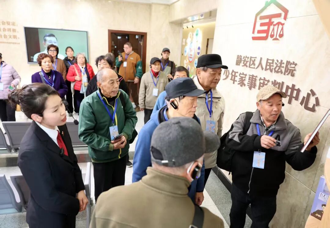 随后,老年朋友们满怀期待地步入静安区人民法院审判大楼,在讲解员的细致引导下,沉浸式感受人民法院专为老年人打造的 “适老化”诉讼服务:导诉台前,老花镜、AED 急救设备、便携轮椅一应俱全,银龄志愿者为老年当事人提供“一对一”的诉讼指引与咨询;圆桌法庭以正圆形布局打破隔阂,营造缓和宽松的庭审氛围,家事纠纷在温情中依法化解。