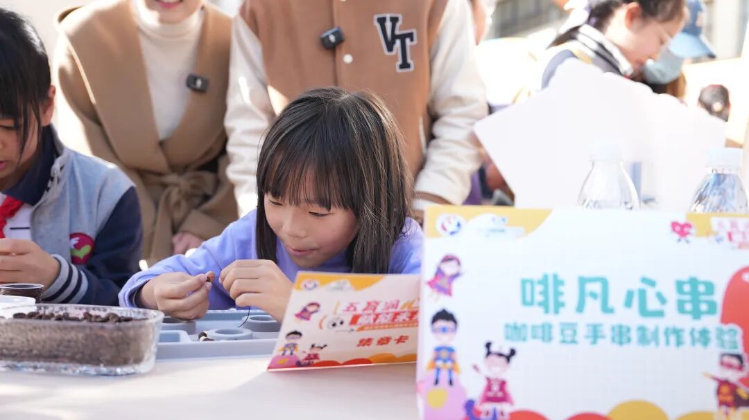 上海市世外中学带来了“啡凡心串”咖啡豆手作,咖啡豆自带的香气能安抚孩子们的情绪,在穿针引线串联咖啡豆的过程中,注意力聚焦于指尖的触感与节奏,更有助于孩子们将纷扰的思绪渐渐沉淀。