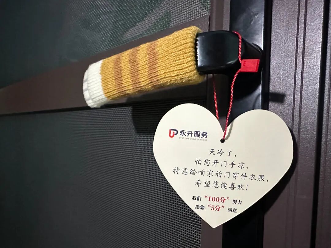 防寒工作不仅关乎基础设施的安全,更在于提升居民生活中的暖意。在旭辉华庭小区和路劲悦茂府小区,除了为楼栋单元门统一安装上厚实的绒面保暖套外,一个格外有趣的细节赢得了业主们的称赞。记者在楼栋内看到,每家的入户门把手都被套上了可爱的“保暖衣”,上面还附有温馨的祝福语。
