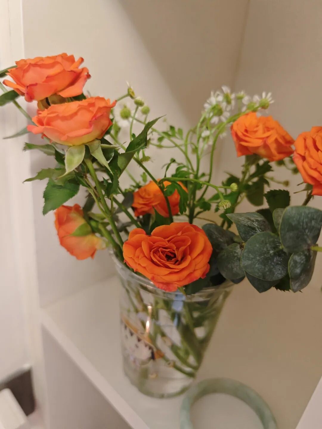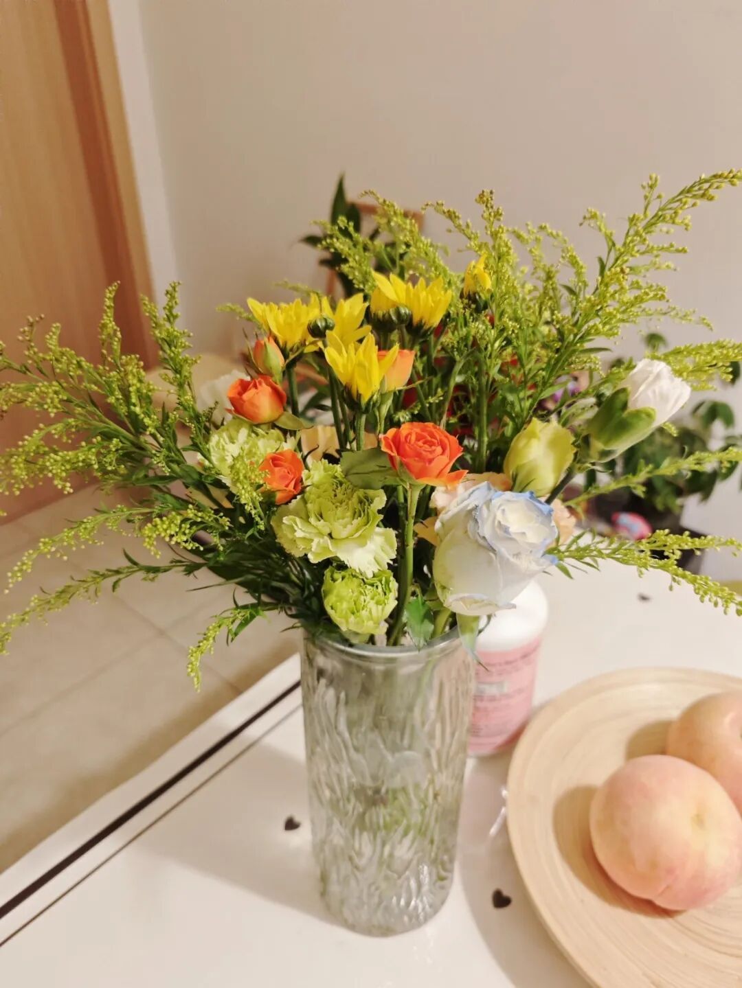 不必遵循花艺章法,只是随心地挑选几枝:碎冰蓝的冷艳、多头玫瑰的热烈、洋桔梗的温柔、雏菊的天真,再点缀几缕黄莺的翠意……修剪枝叶时,我仿佛也修去了日间的烦杂。看花草在清水中舒展身姿,如同看见自己渐渐松弛的倒影。这一刻,我与自己和解,借一缕花香,重新连上生活的“电源”。