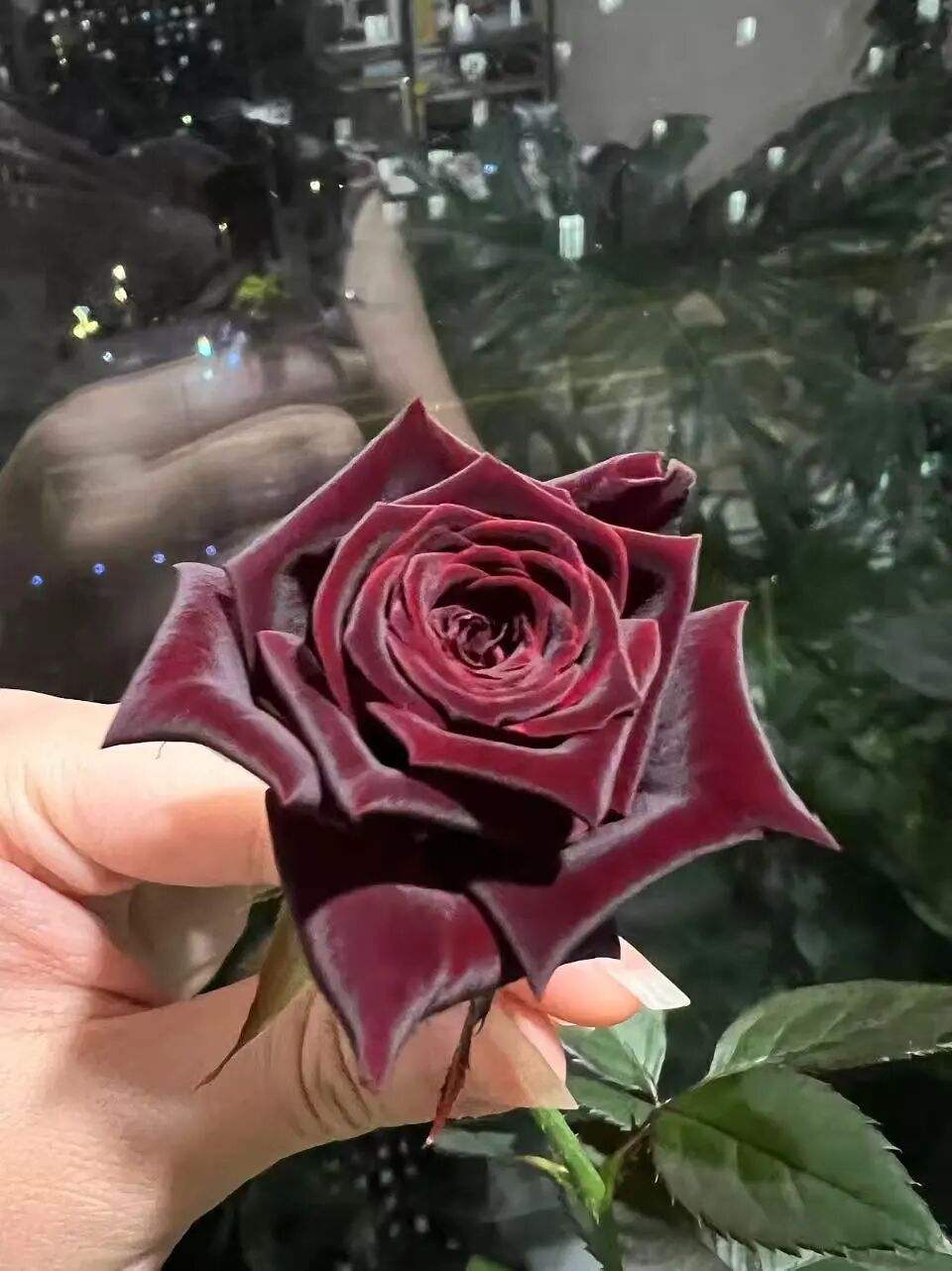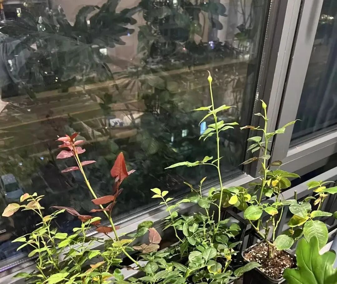 每晚我都会走进这一方小小的绿色天地。绿萝垂下的藤蔓,如翠绿的丝绦,在灯光下轻轻摇曳;春羽舒展着羽状的叶片,仿佛在伸展着慵懒的身姿。窗前的月季,虽过了盛花期,却仍有几朵倔强地绽放,花瓣在暖光中透出丝绒一般的质感。