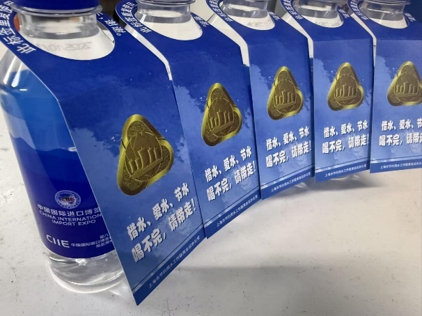 进博会期间,在国家会展中心的核心区域,节水宣传成为展会一道独特的“绿色风景”。从人流密集区的节水海报倡议,到瓶装水专属节水标语提醒,现场通过多维度、场景化的举措,让“清瓶行动”(喝完每一瓶水)成为展会新风尚,推动节水理念贯穿进博会全程,将进博会的国际影响力转化为节水宣传的传播力。