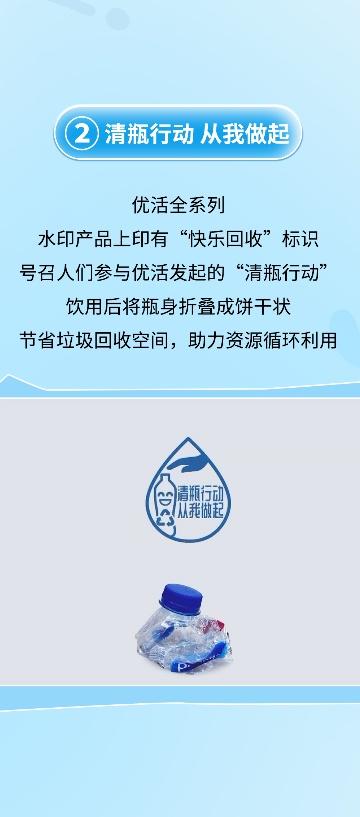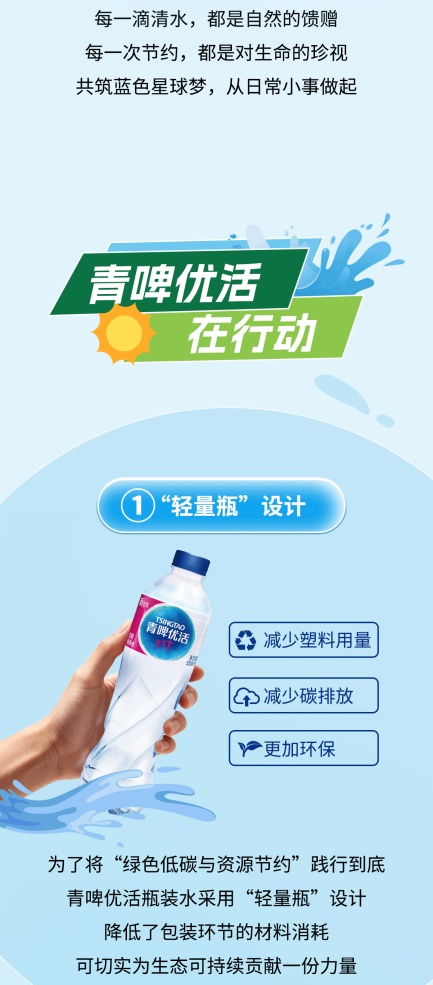 联合知名饮料厂商青啤优活,在优活全系列产品上印制节水标语,通过“产品即载体”的创新形式,让节水理念伴随日常消费场景触达更多人群。