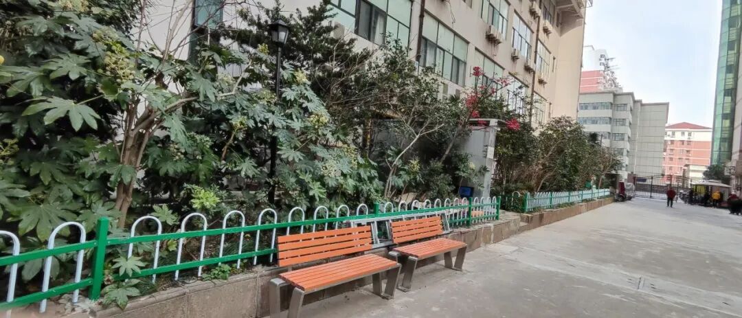 华升公寓由两栋34层高楼组成,因年久失修、管理缺位,一度出现绿化杂乱、幕墙开裂、消防隐患等问题。为改变现状,居民区党组织牵头启动小区环境整治,通过修剪绿化、更新护栏,并在门口开辟出一处配有遮阳伞和桌椅的户外“歇脚角”,打造了一个开放、亲民的睦邻议事空间。