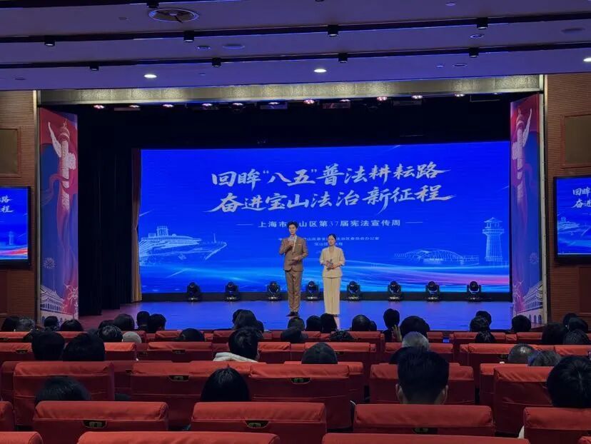 “八五”普法回顾照片展播以5分钟短片浓缩五年成果,系统呈现宝山法治品牌打造、文化作品创作等亮点工作。最后,与会领导共同上台,宣布宝山区第37届宪法宣传周正式启动。