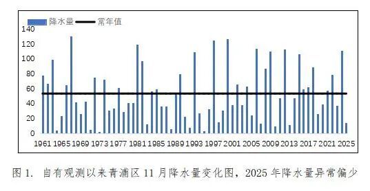 青浦区11月降水量14.5毫米,较常年偏少7成。