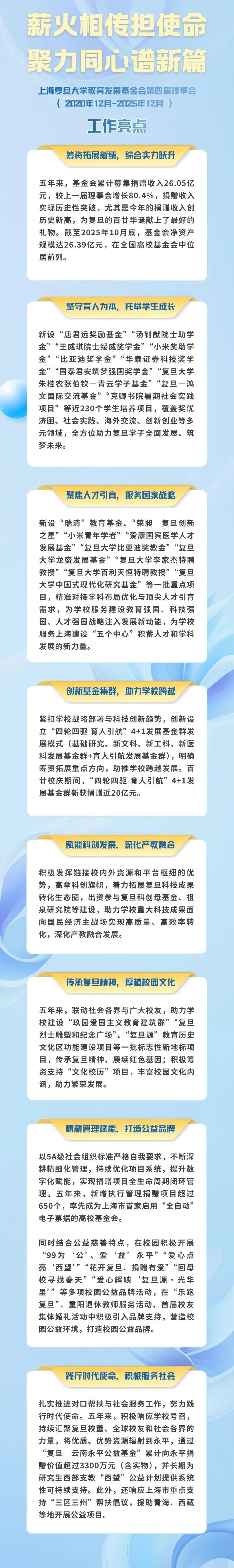 在随后举行的第五届理事会第一次会议上,新一届理事会负责人选举产生,裘新当选理事长,金海燕当选副理事长,复旦大学对外联络与发展处处长刘莉当选秘书长。会议审议副秘书长人选建议名单,听取并审议基金会2026年工作计划、2026年预算方案。