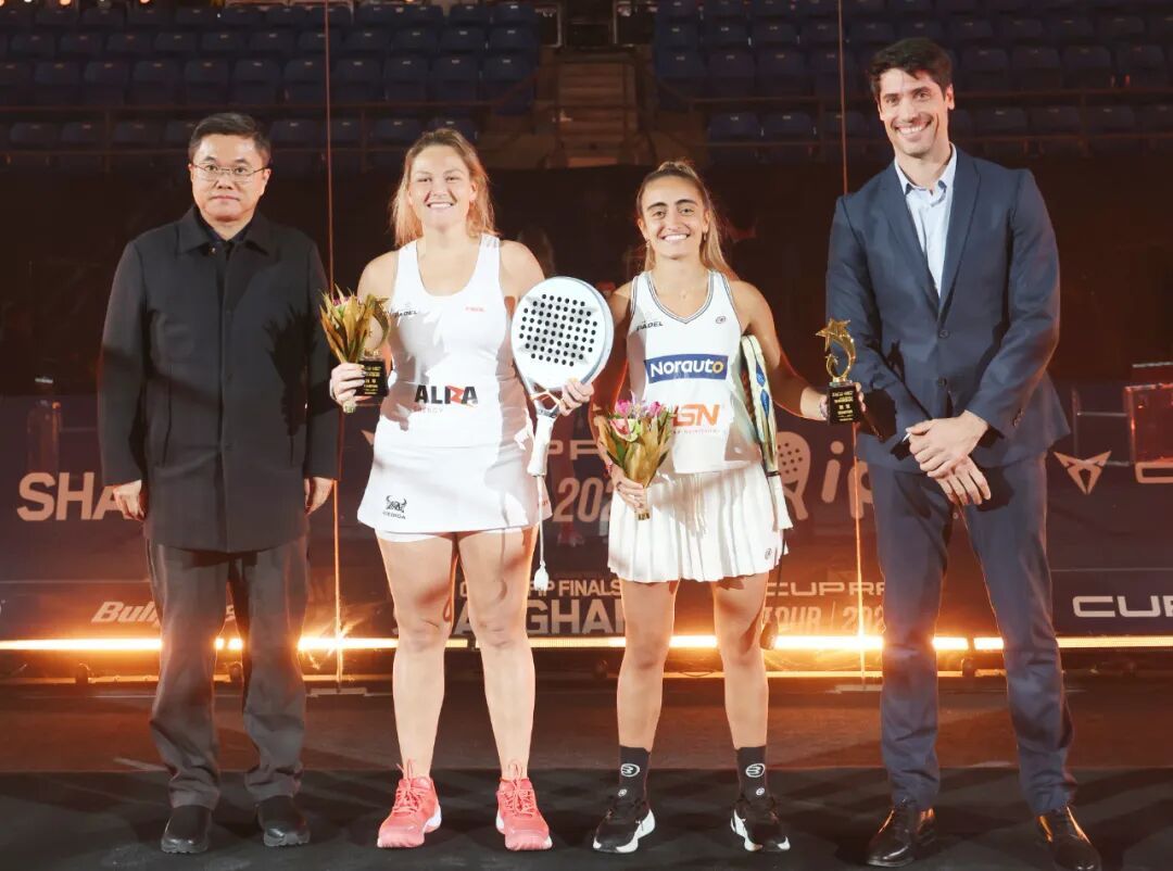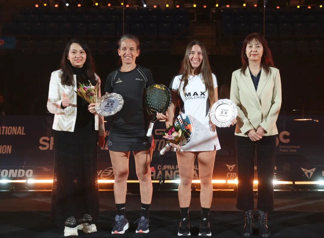 薛侃与国际板式网球联合会(FIP)赛事总监吉列尔莫为女子组冠军颁奖。