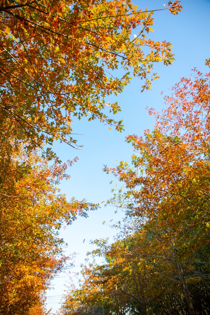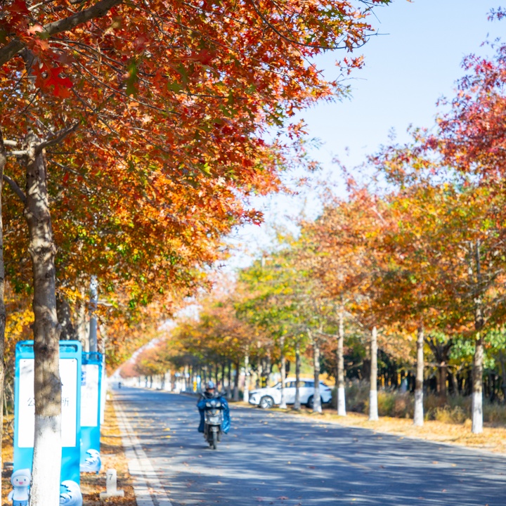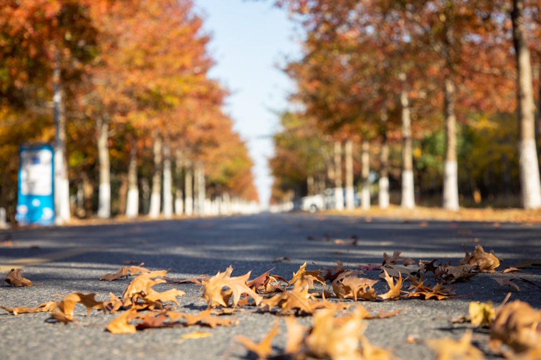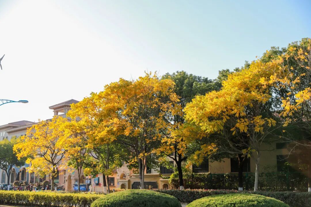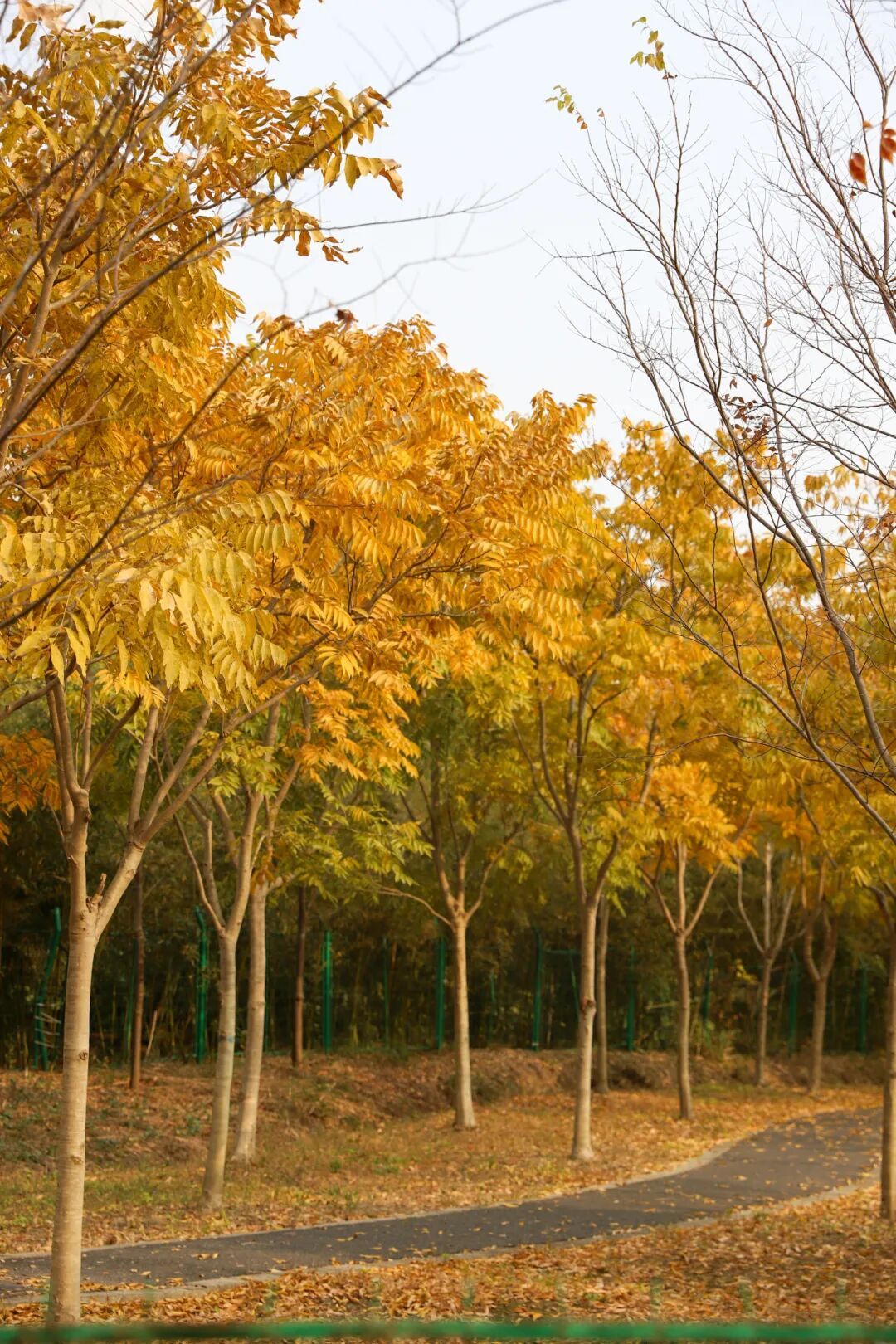 光线从枝叶的缝隙里漏下来,在干净的路面上投下摇曳的光斑。走过去,脚下踩着明明暗暗的影子,心里却仿佛被这满眼的暖色调烘得格外柔和。