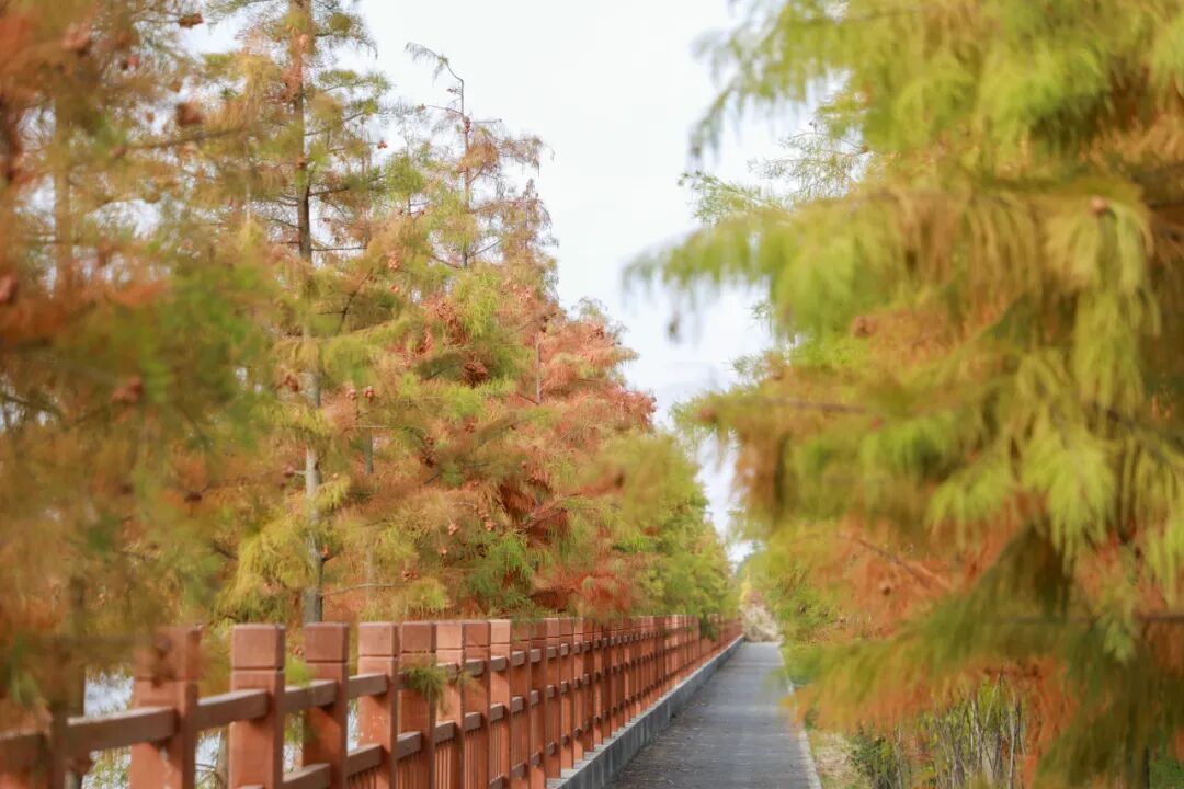 紫石泾河道旁的水杉,它们褪去春夏的青衫,换上了一身日渐浓郁的锈红,笔直地列队在河岸,将身影投入潺潺流水。天空、树影与水光在此交织,沉静而庄严,仿佛一条通往季节深处的长廊。