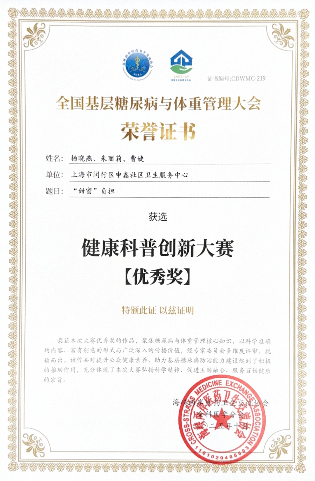 好消息!在日前举行的2025全国基层糖尿病和体重管理大会“健康科普创新大赛”上,莘庄工业区申鑫社区卫生服务中心的健康科普作品《“甜蜜”负担》斩获优秀奖!一起去看看这部既有创意又有温度的作品吧~ 据介绍,《“甜蜜”负担》由杨晓燕、朱丽莉、曹婕三位公共卫生科医务人员共同创作。作品名中的“甜蜜”是指糖尿病患者与血糖之间需精细平衡的特殊关系——血糖过高或过低皆有风险;“负担”则指向长期血糖监测带来的现实压力,如反复采血、持续记录与方案调整等。 基于这一现实背景,作品聚焦社会公众对糖尿病普遍存在的认知误区,如“只有老年人才会患病”“没有明显症状就无需干预”等,通过介绍血糖监测的意义、常用方式、关键指标及监测时间,帮助公众建立科学、规范的疾病管理认知。同时,作品着力减轻患者对疾病的恐惧,强化自我管理意识与信心,降低并发症风险,助力慢性病规范管理。