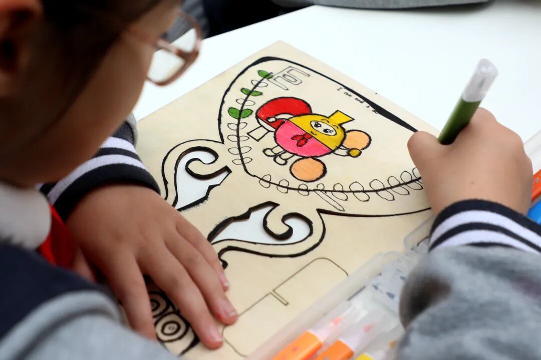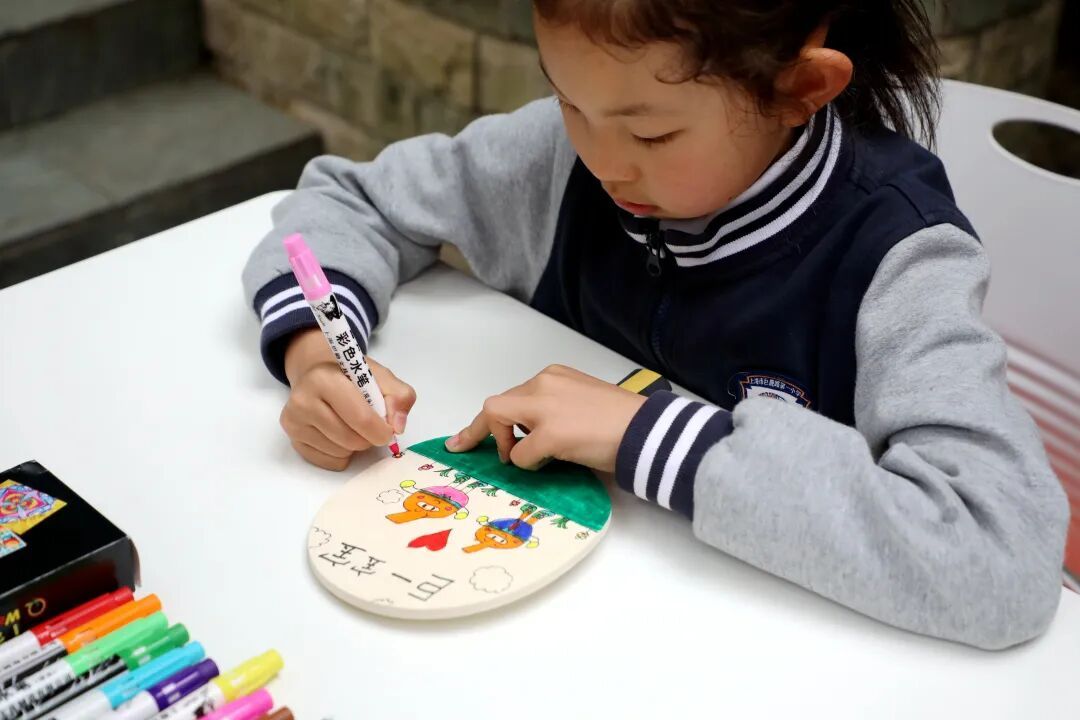 一年级孩子牵着高年级哥哥姐姐的手,走进学校乒乓馆,听他们讲述学校辉煌的乒乓历史,了解一座座奖杯背后的故事;二年级学生聚焦“民族团结”,将抽象的概念转化为可触可感的视觉符号,在乒乓板上进行手绘创作。
