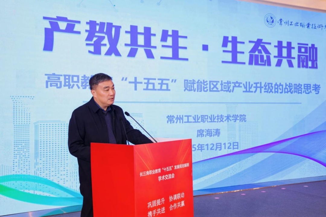 常州工业职业技术学院党委书记席海涛作“产教共生·生态共融:高职教育‘十五五’赋能区域产业升级的战略思考”主旨报告。他认为,“十五五”时期,高职要成为高水平技术技能人才的主基地、促进更高质量就业的稳定器、构建融通融合体系立交桥、教育数字化转型和创新的先行区、对外开放与区域协调发展的助推器,破局的关键在于发挥链主企业龙头牵引力、强化资源整合平台聚合力、提升数字赋能技术支撑力,最终实现职业教育高质量发展与区域产业升级的双向奔赴。