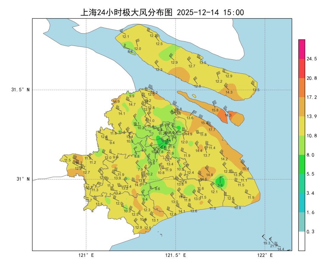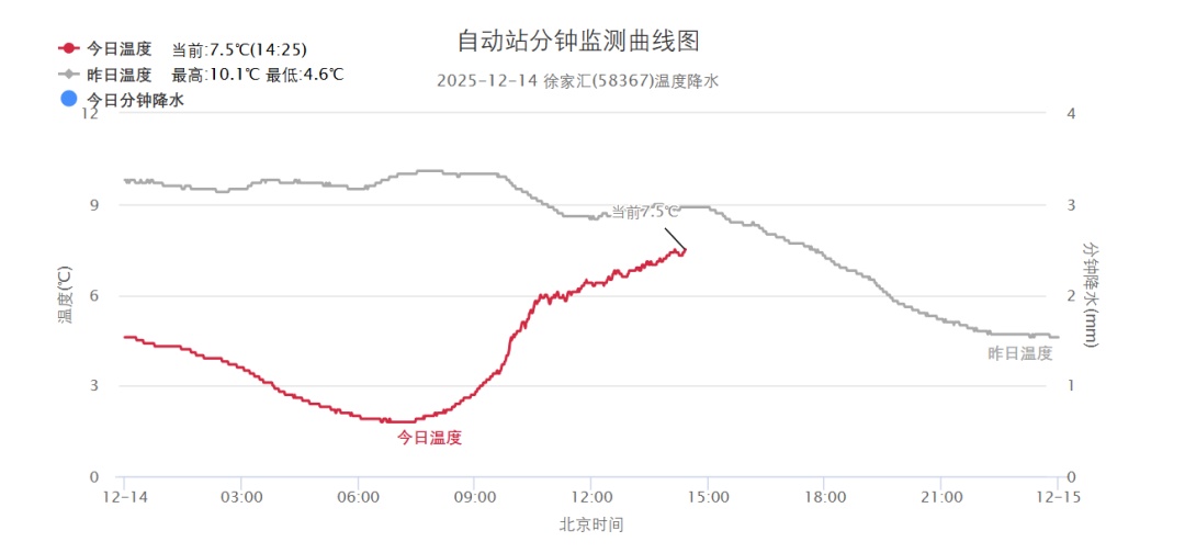 冷气团控制下,今天天空状况转好,切到晴冷模式。气温被打压到了近期的低位,早间寒意十足,白天虽然太阳高挂,但升温相对吃力,全市最高气温勉强突破8℃,徐家汇站8.2℃。配合着阵阵北风,冷上加冷,很有冬天的感觉~提醒市民虽然天气变化最剧烈、最明显的时段已经过去,但寒冷天气仍将持续,务必继续做好防寒保暖工作。