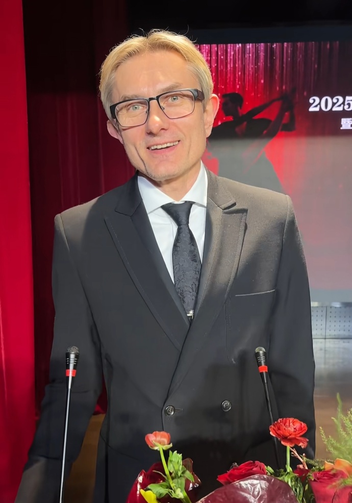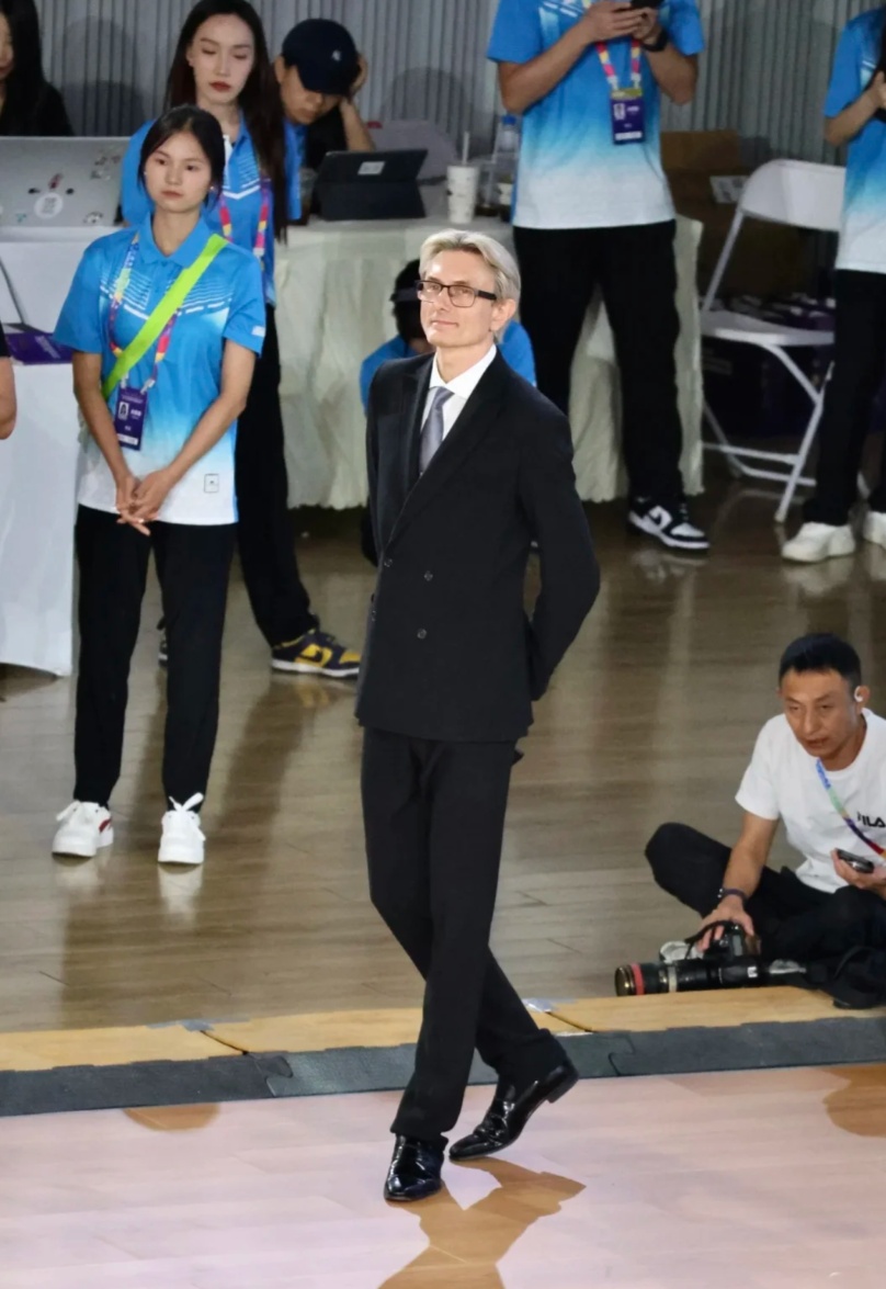 1970年出生的辛金斯来自拉脱维亚,7岁开始跳舞,先是职业舞者,后来退役转做教练与裁判。2024年无锡的亚洲体育舞蹈节,他第一次来中国执裁。成都世运会,是他的第二次中国之旅。