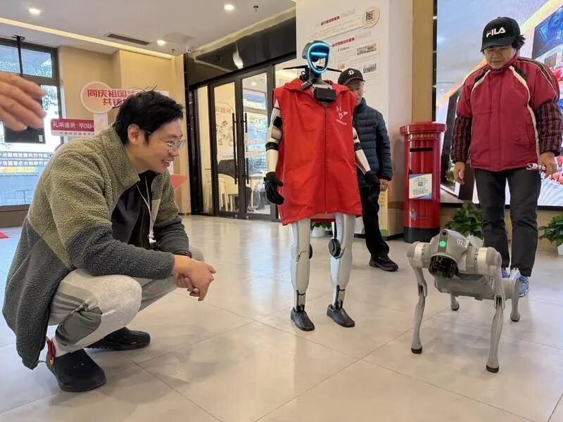 这对“网红搭档”的亮相,并非偶然。今年8月,国内人形机器人领域头部企业——宇树科技的全资子公司“宇树上海高羿科技”正式落户庙行镇。企业不仅为当地带来了前沿智能技术,也积极推动“机器人+民生服务”场景落地。此次入驻共康党群服务中心的机器人与机器狗,正是庙行镇与企业的最新合作,既让居民零距离感受智能科技的温度,也让党群服务更具吸引力。 党群服务中心工作人员介绍:“机器人主要担任讲解员,向大家介绍大厅、食堂等功能区;机器狗则负责互动、活跃气氛。它们的加入让服务更有趣,人流量明显增加。”