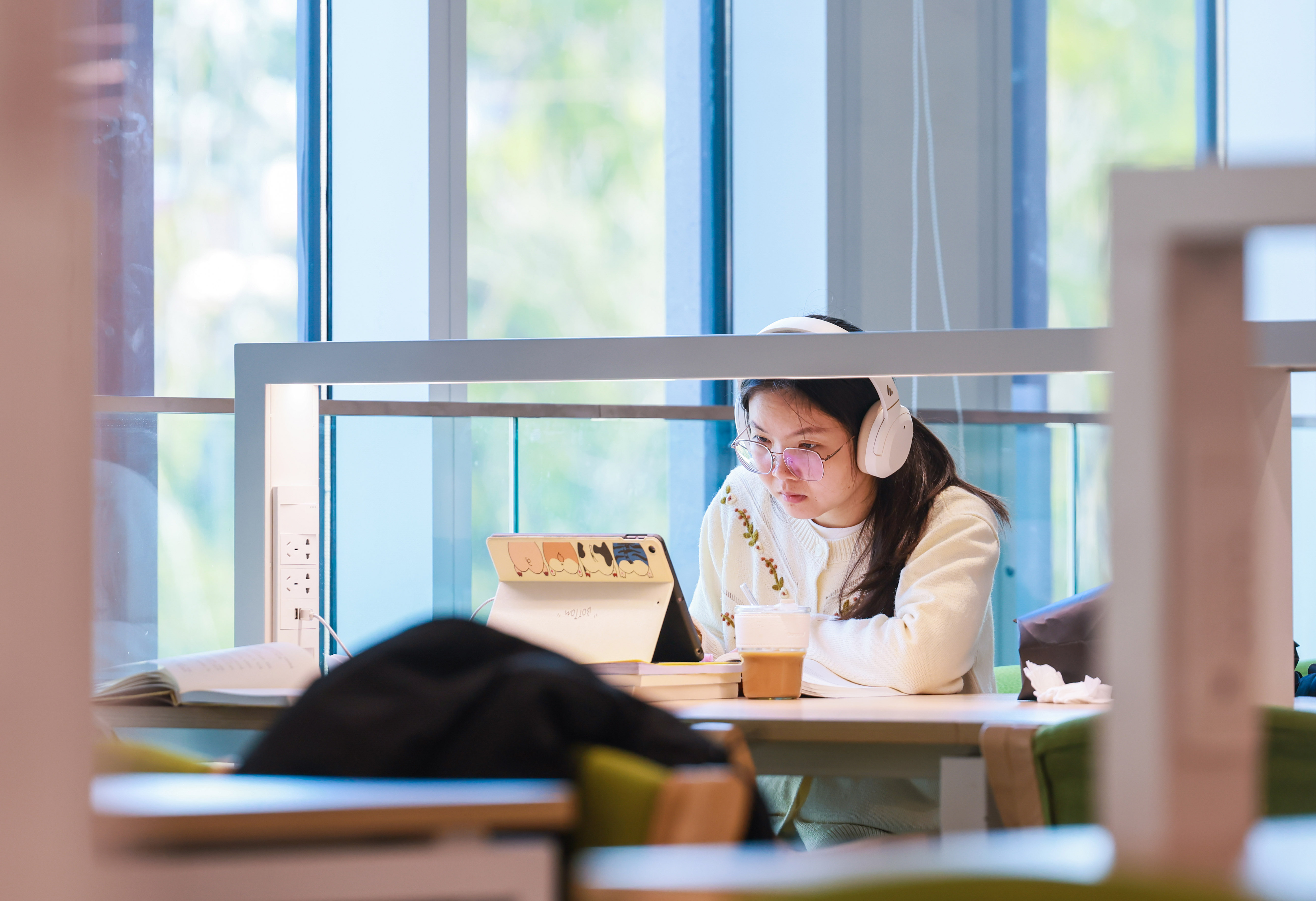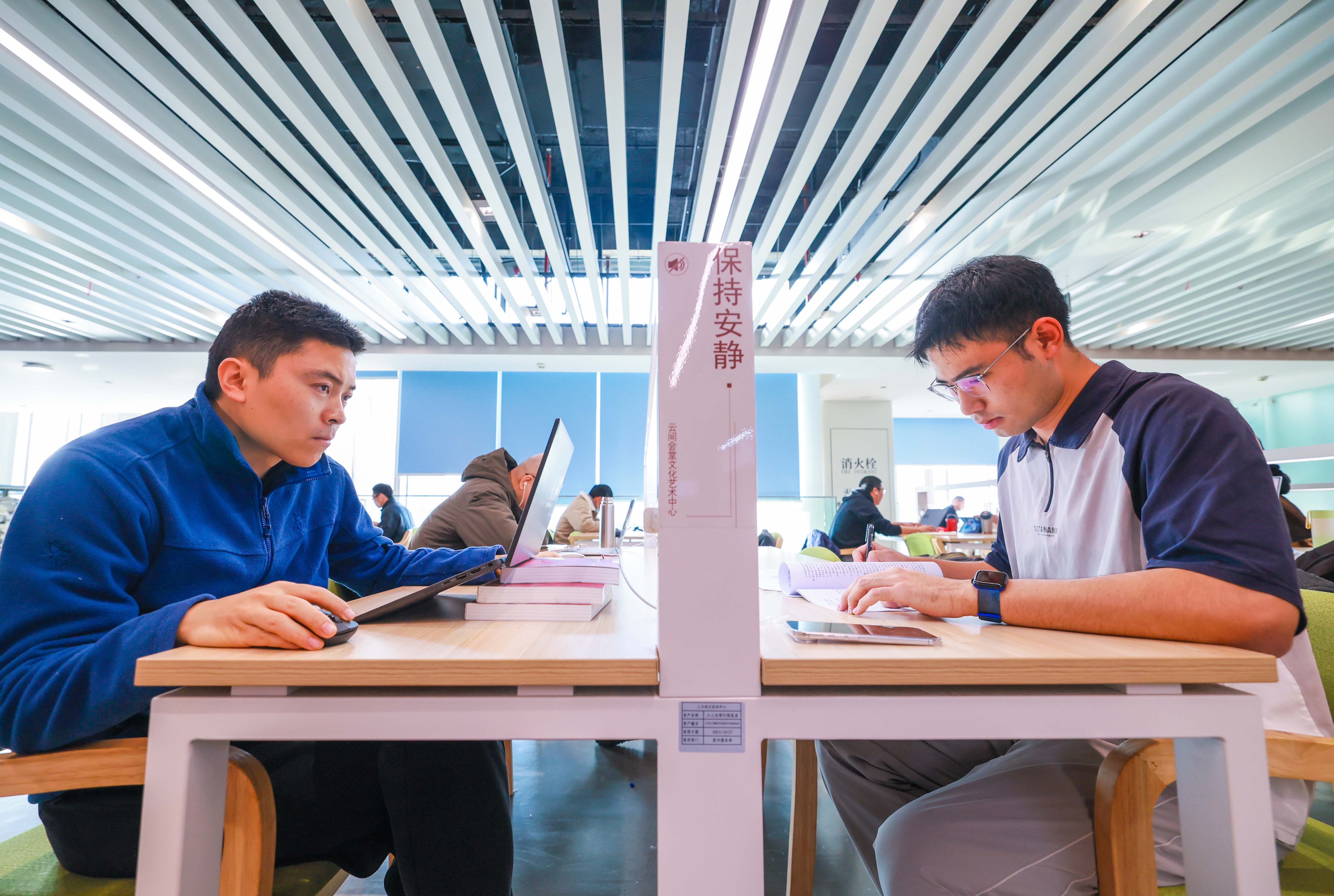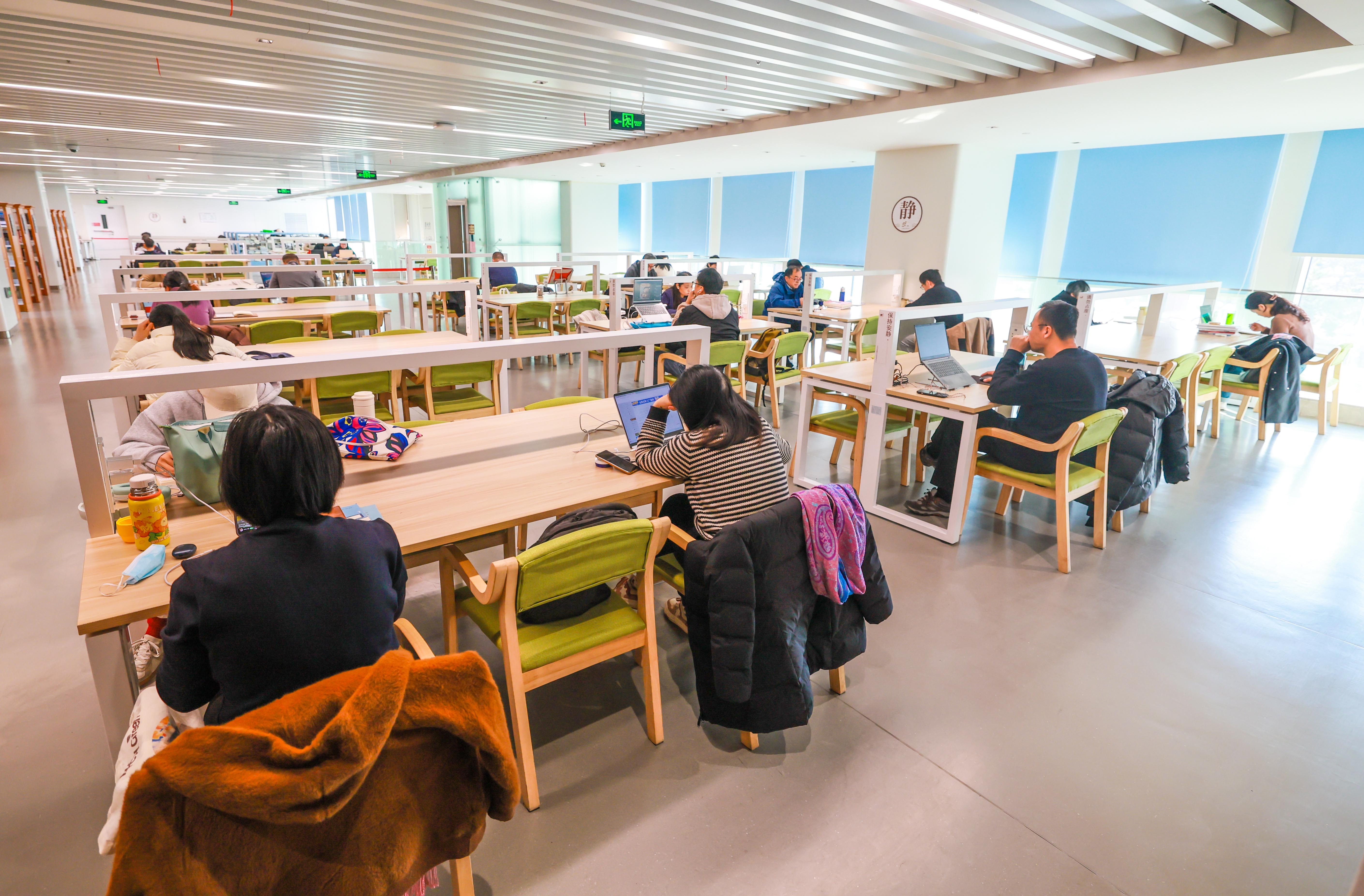 2026年考研在即,松江区图书馆内,考生们伏案刷题、捧书默读,于静谧空间专注冲刺。纸笔伴阳光,勾勒出冬日奋斗图景。记者 蔡斌 摄