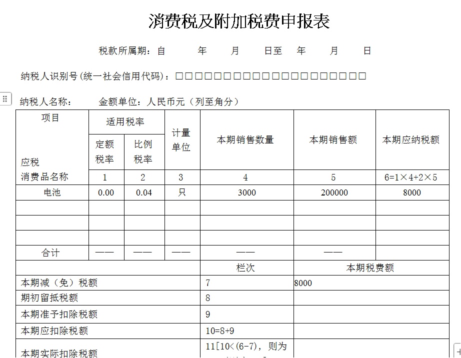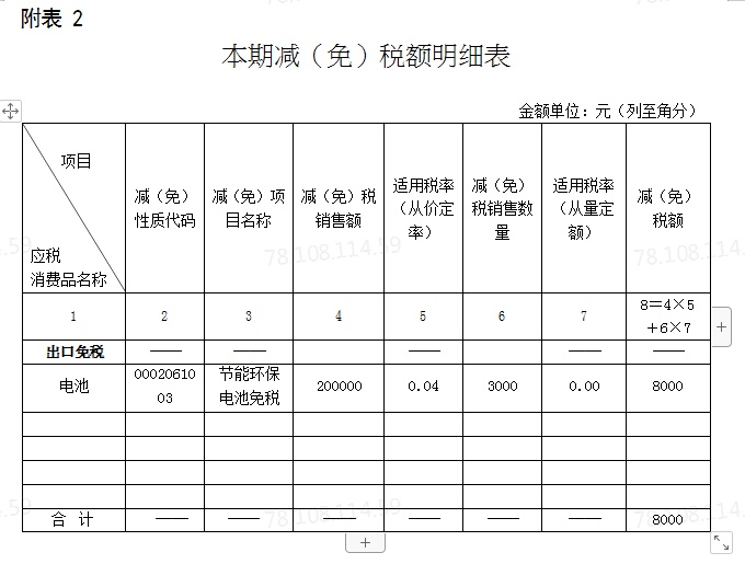 纳税人发生符合条件的电池和涂料免征消费税事项,免征消费税的销售额应当填写在《消费税及附加税费申报表》主表、《本期减(免)税额明细表》相关栏次。以发生符合条件的电池不含税销售额200000元为例: